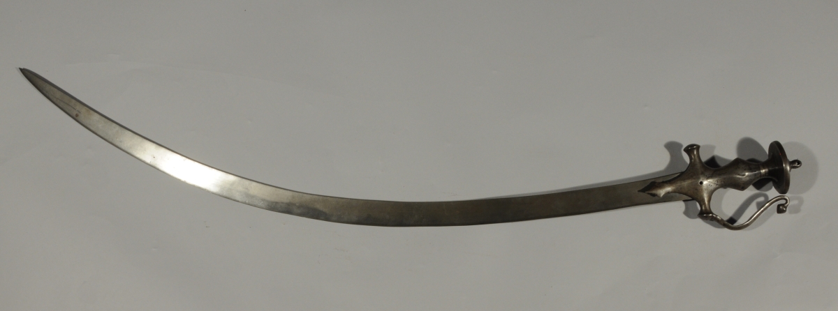 Poignée et monture en fer, garde une branche à deux quillons et oreilles. Lame courbe à dos plat.