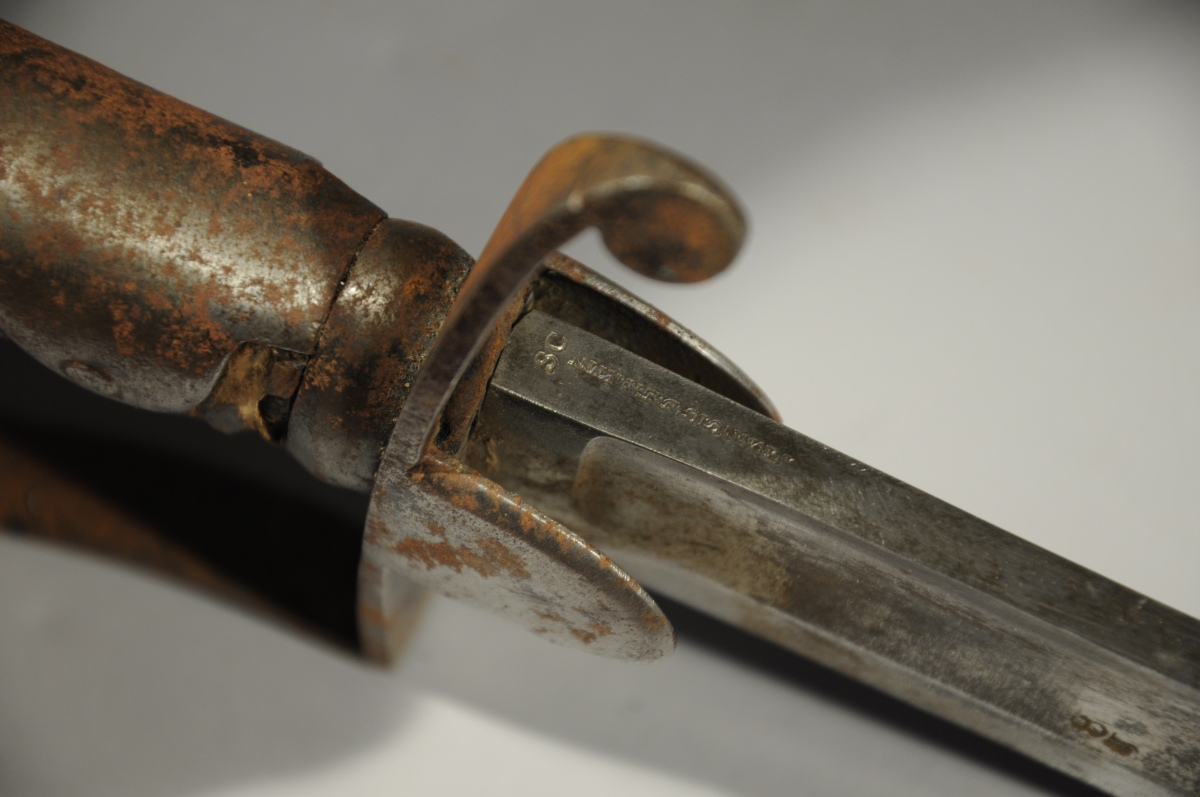 SABRE DE CAVALERIE prussien ou britannique. Monture en fer, garde à une branche à la Blücher, à deux demi oreillons. Lame courbe à dos plat, pans creux. Fourreau en tôle de fer à deux bracelets.