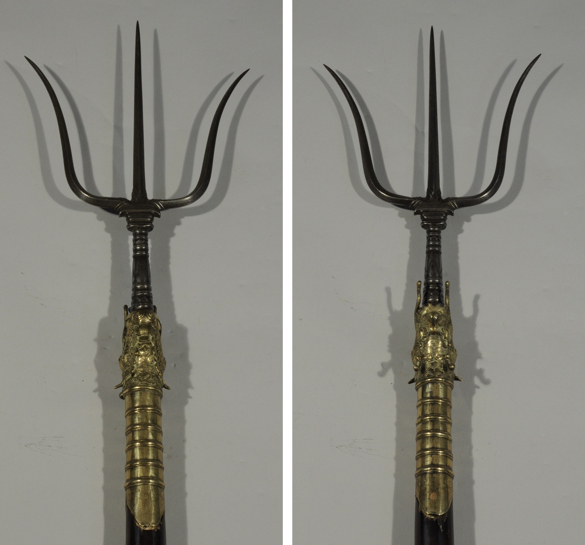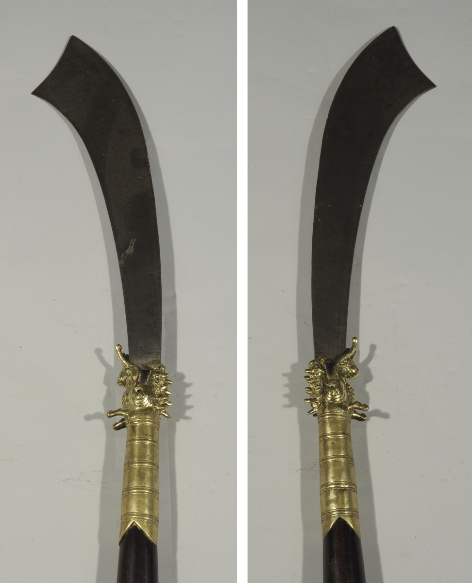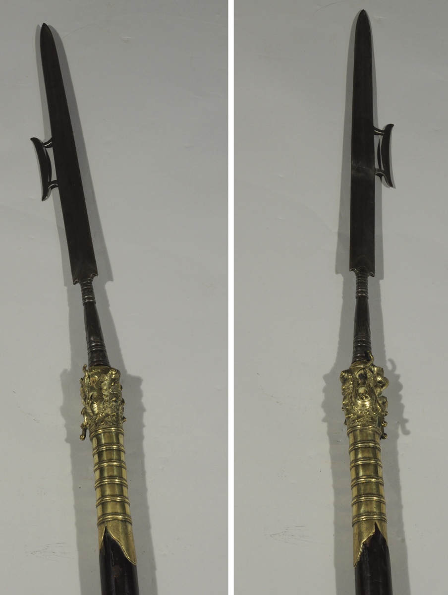 Montées sur des hampes en bois à douilles en laiton ciselé de têtes de dragon en ronde bosse et gravées.