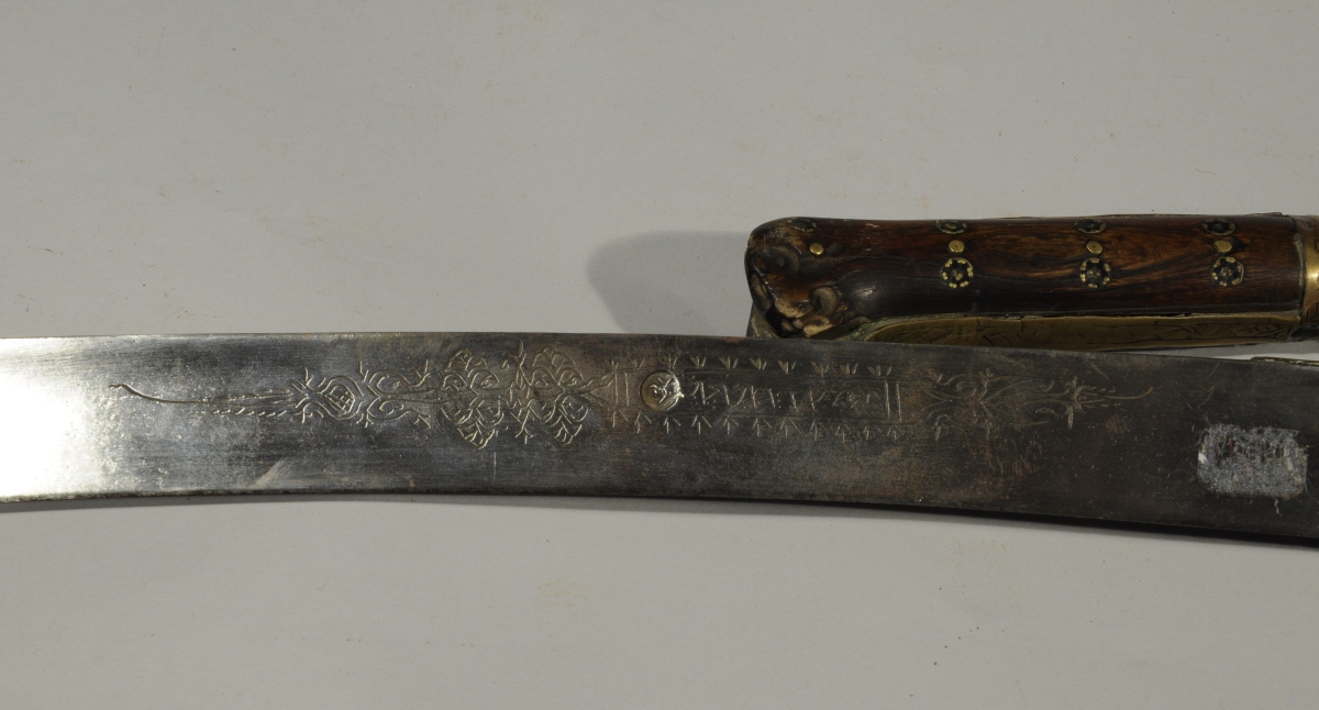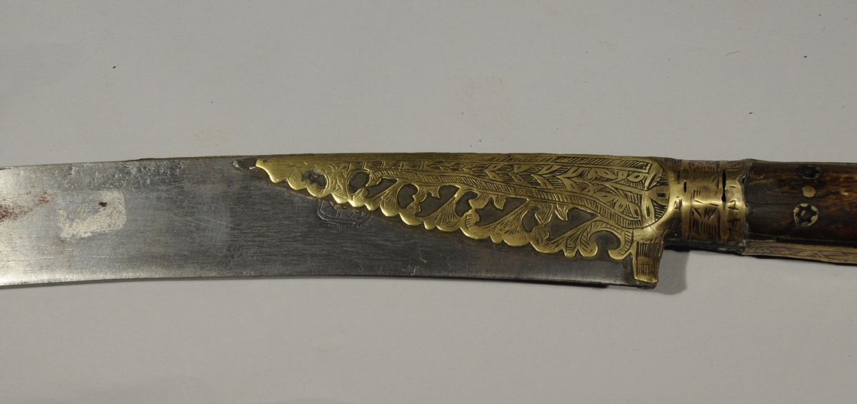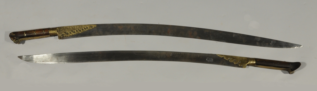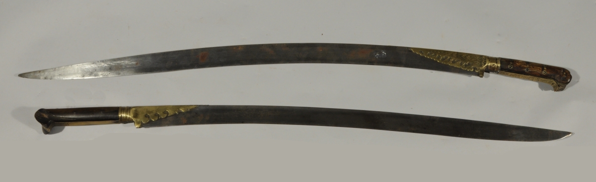 2 SABRES OTTOMANS dits YATAGANS. Poignées à plaquettes, un de corne, l'autre de bois. Montures en laiton. Lames cintrées, avec marquages.