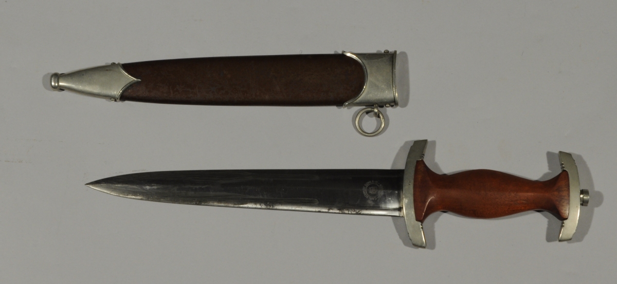 DAGUE DE PARADE. Poignée de forme chantournée, monture en métal, fusée en bois teinté. Lame droite à double tranchant gravée "Alles für Deutschland" et marquée "Carl Schmidt Sohn A-G / Solingen". Fourreau en métal patiné à deux garnitures en métal. Un anneau d'attache.