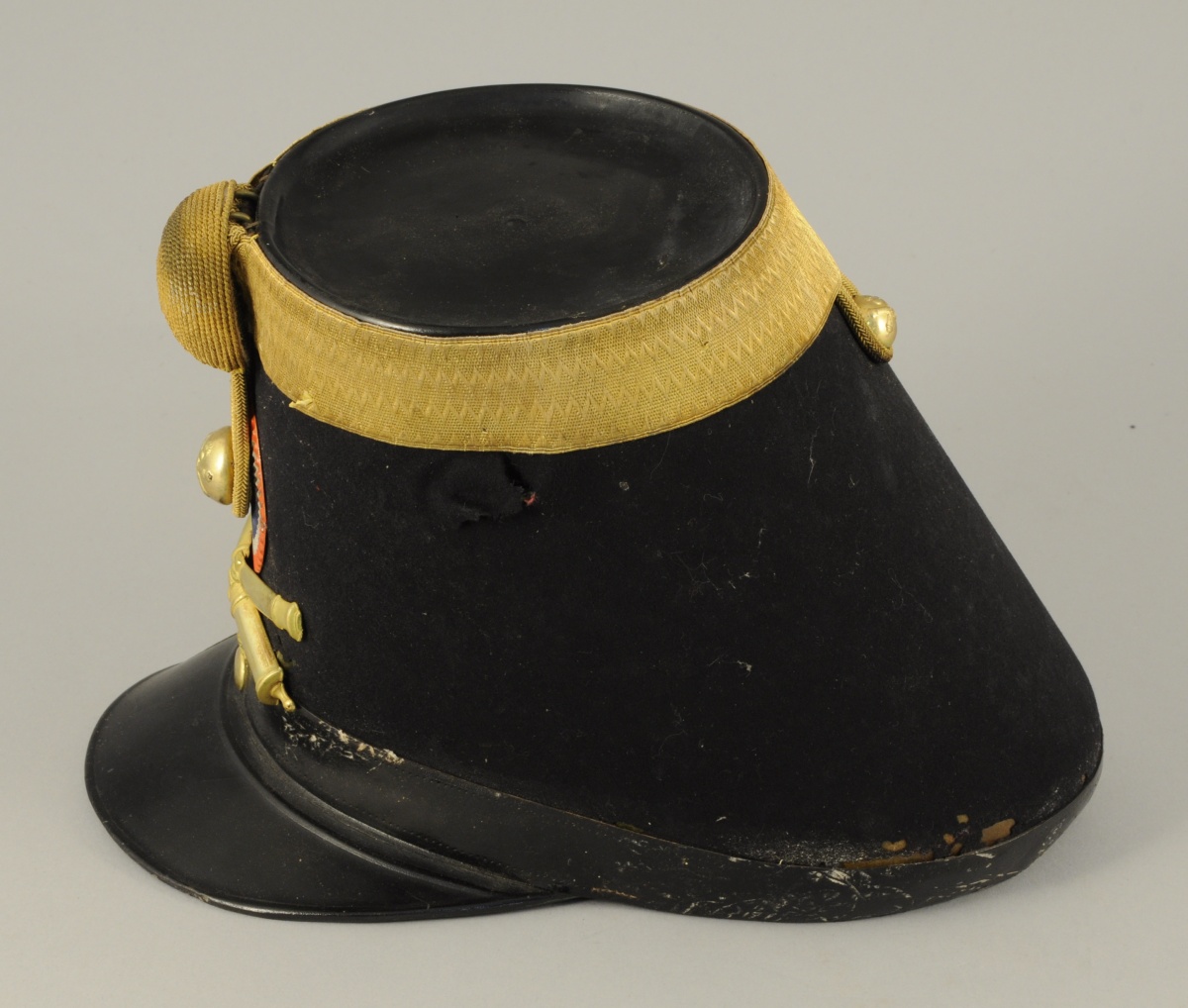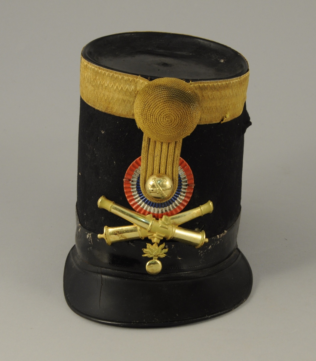 Fût recouvert de drap noir. Calotte, bourdalou et visière en cuir verni. Galon, pompon et ganse de cocarde brodé or. Bouton, motifs aux canons entrecroisés et à la grenade en laiton doré.