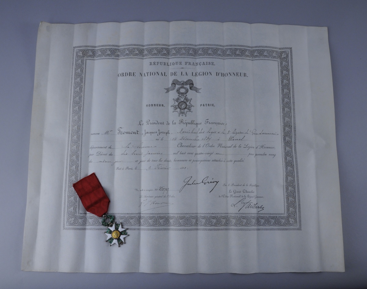Le brevet décerné à Jacques Joseph Froment, maréchal des logis à la 3ème légion de gendarmerie, en 1881.