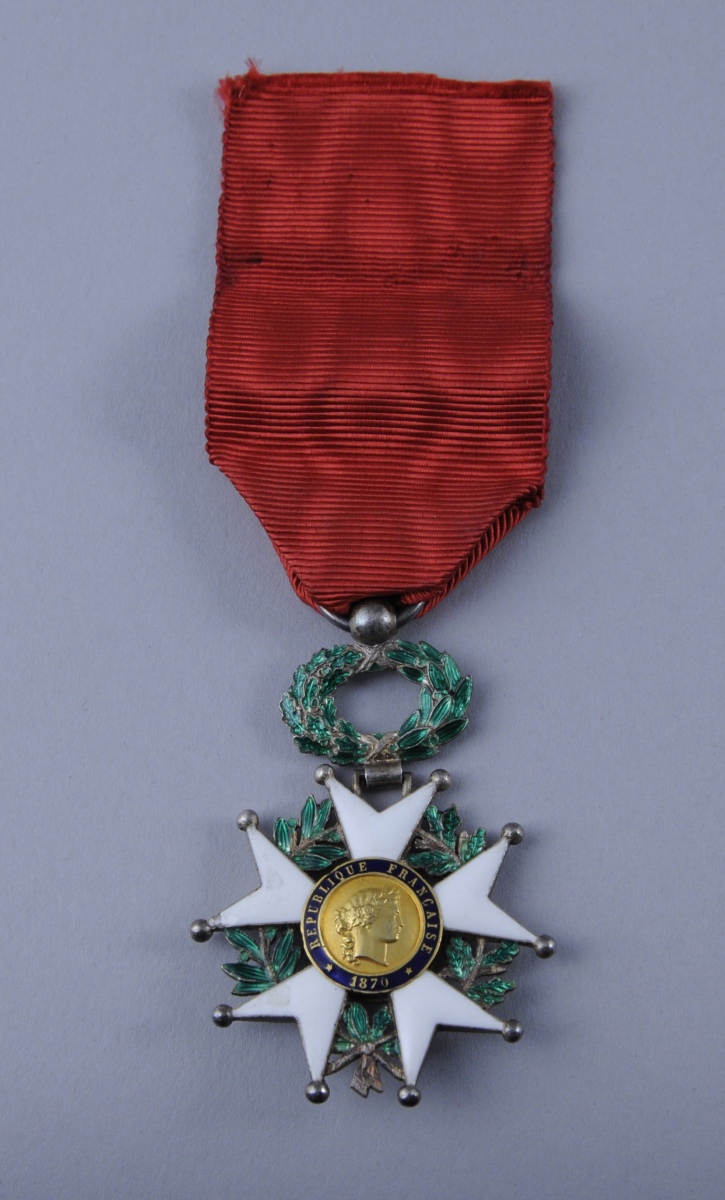 LÉGION D'HONNEUR ET SON BREVET. Le bijou en argent. Les bras de la croix émaillés blancs, les couronnes de laurier et chêne émaillées vert translucide.