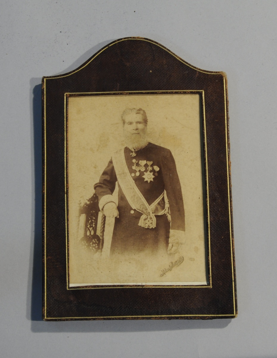 - Photographie de Camille de Rochetaillée portant ses décorations signée Helena de Mozovsky. Dans un cadre en maroquin brun. XIXème. 13, 5 x 9,5 cm.