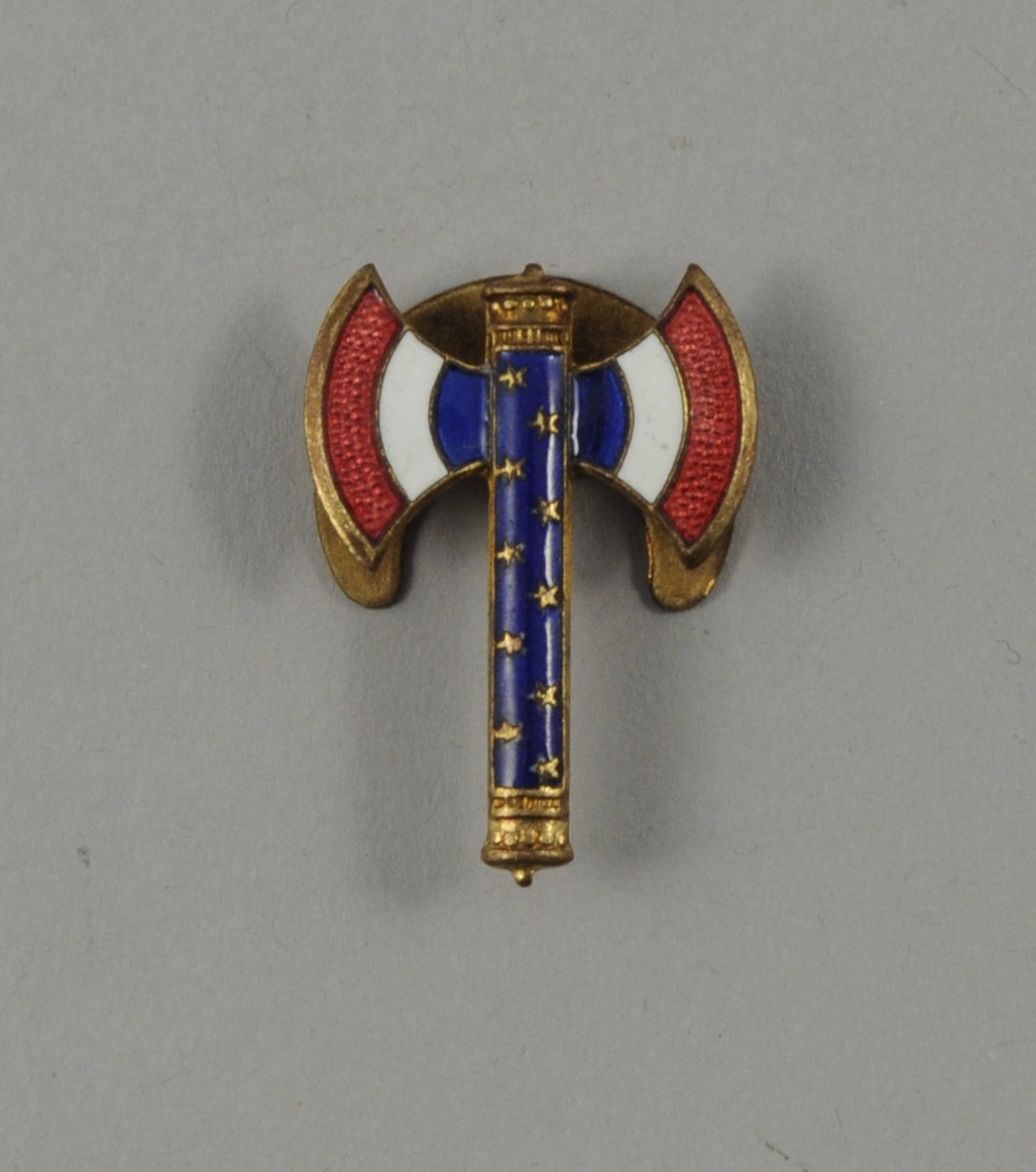 Insigne pour boutonnière en laiton et émail bleu, blanc et rouge représentant le bâton de maréchal émaillé de bleu, à 10 étoiles et extrémités en laiton, constituant le manche où s'attachent deux fers émaillés tricolore.