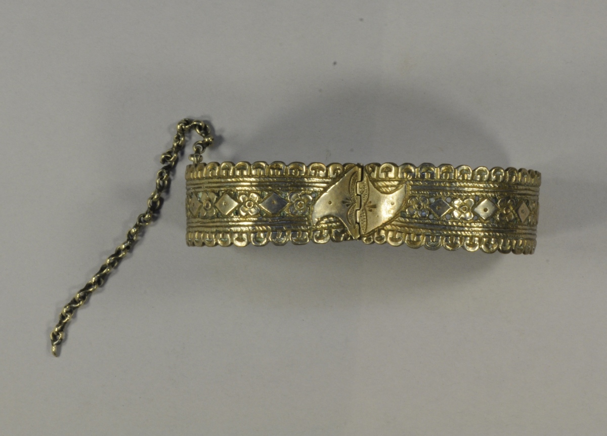 -BRACELET rond rigide en argent anciennement doré présentant un décor de frises de fleurettes et losanges, d'agrafes, de filets et cordelettes. Une chaînette y est accrochée. Diam. 6 cm.