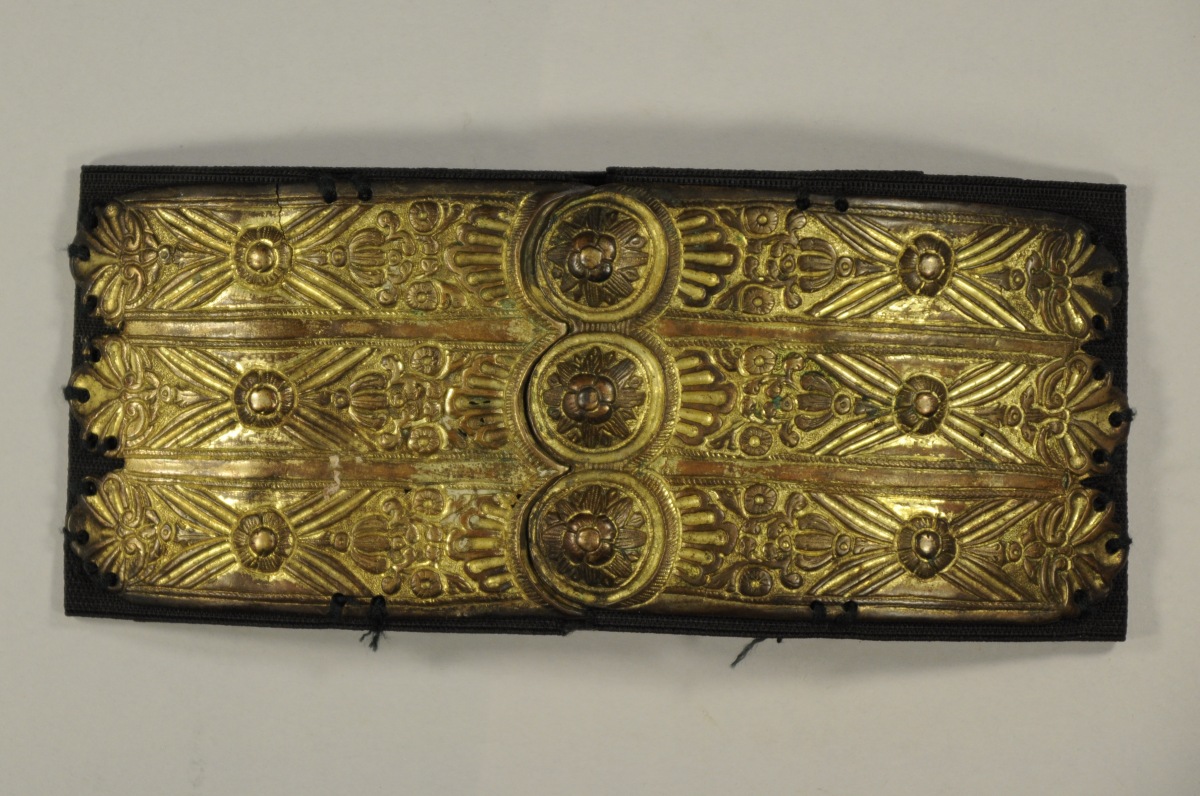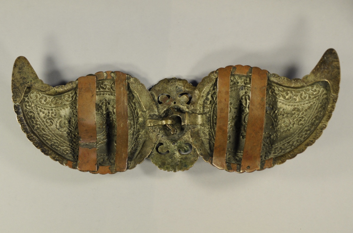 - BOUCLE de CEINTURE en cuivre doré composée des deux parties rigides s'imbriquant l'une dans l'autre par le truchement de trois crochets. Elle présente un décor de motifs végétaux stylisés. Lunxheri, Albanie du Sud. Long. 20, Larg. 7,7 cm. (accidents et usures).