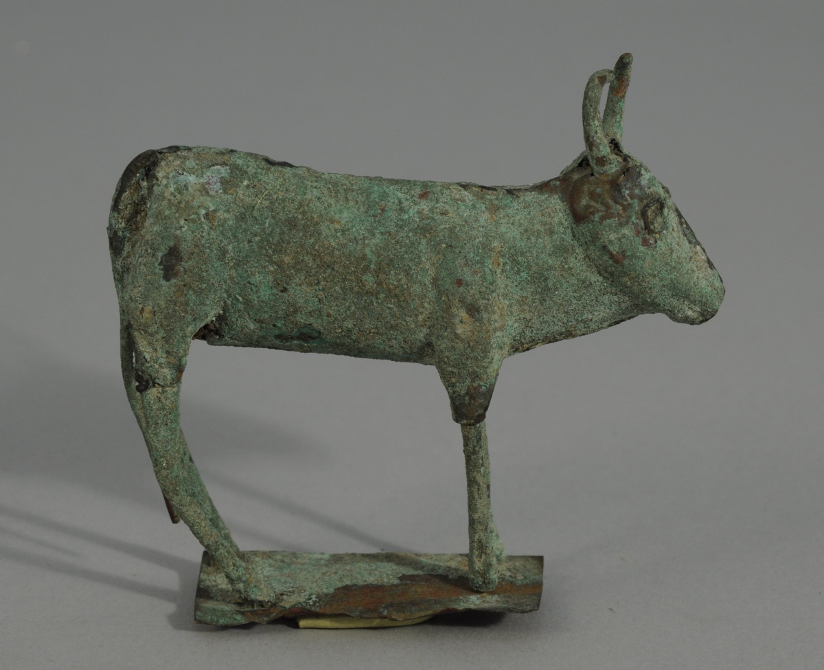 STATUETTE en cuivre à patine vert-de-gris ancienne représentant un taureau. Objet de fouille, région d'Ankara. Haut. 7,5, Long. 8,5 cm.