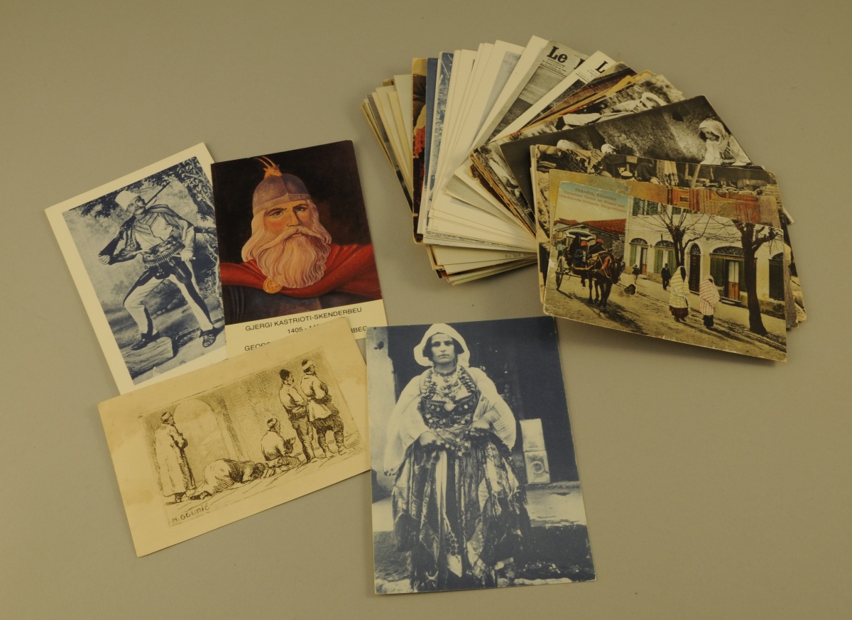 LOT de 35 CARTES POSTALES et 19 TIRAGES ARGENTIQUES représentant des scènes du folklore albanais, des paysans, des vues de village (Marubi), pages illustrées du "Petit Journal", des portraits d'hommes célèbres (Géraldine, épouse du roi Zog, Skënderbeg...), musulmans bosniaques en prière et divers.
