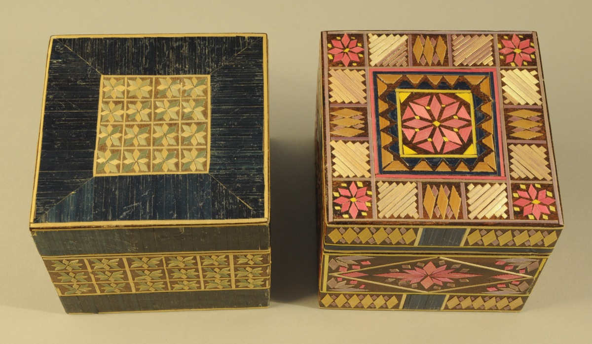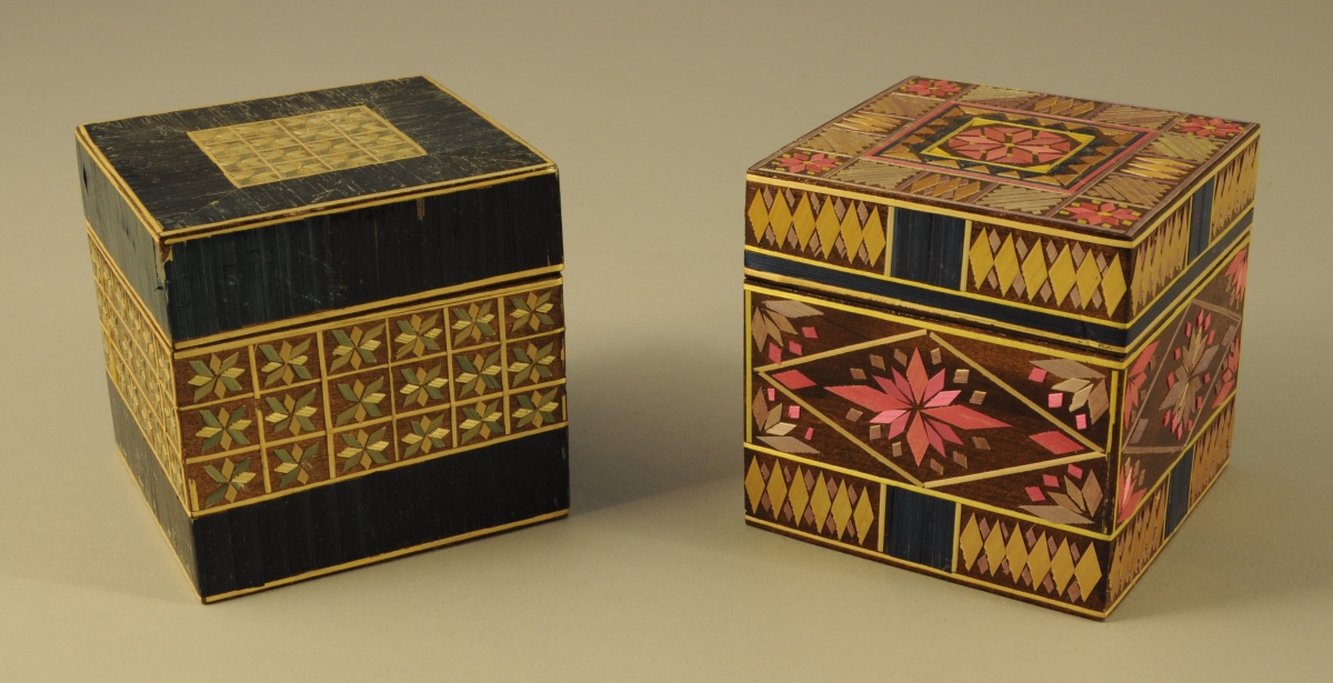 DEUX BOITES cubiques en bois. Décor géométrique et floral en marqueterie de paille polychrome. Larg. 8 cm. (manques)