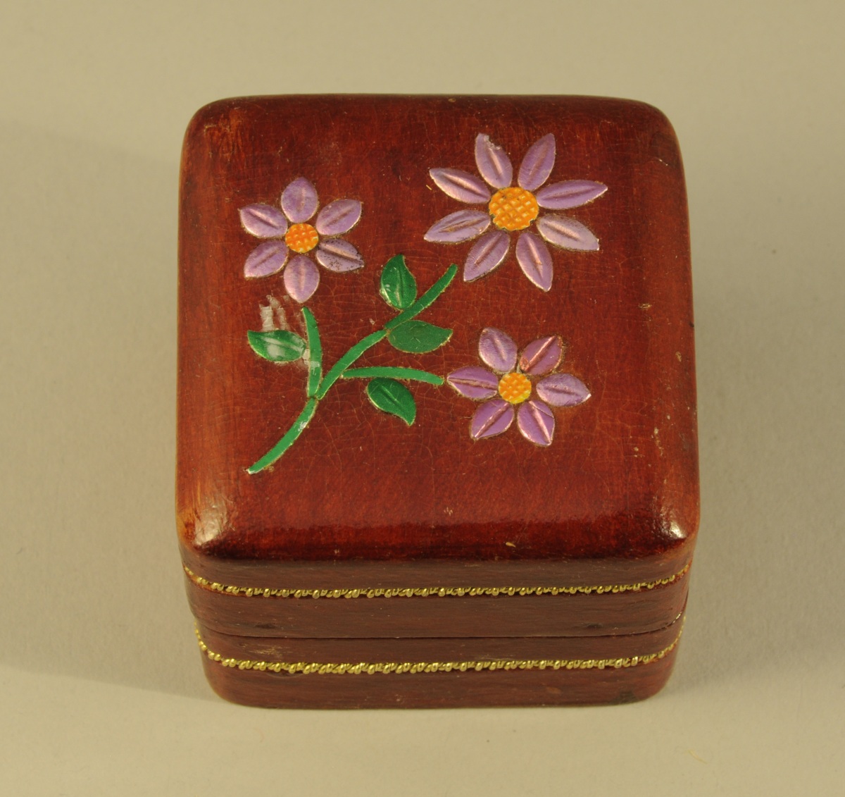 JOINT : ÉCRIN en bois à décor floral polychrome. Haut. 4,5, Larg. 6,5 cm.