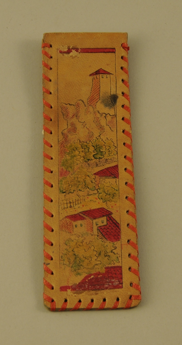 JOINT : ÉTUI de STYLO en cuir fauve à décor polychrome représentant Kruja, la ville natale de Skënderbeg. Long. 16 cm.