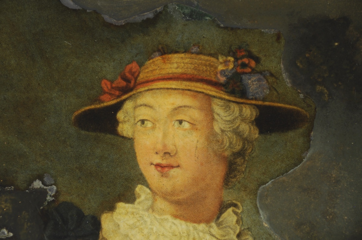 ÉLÉGANTE AU CHAPEAU DE PAILLE.Fixé sous verre polychrome. Fin XIXème.22...
