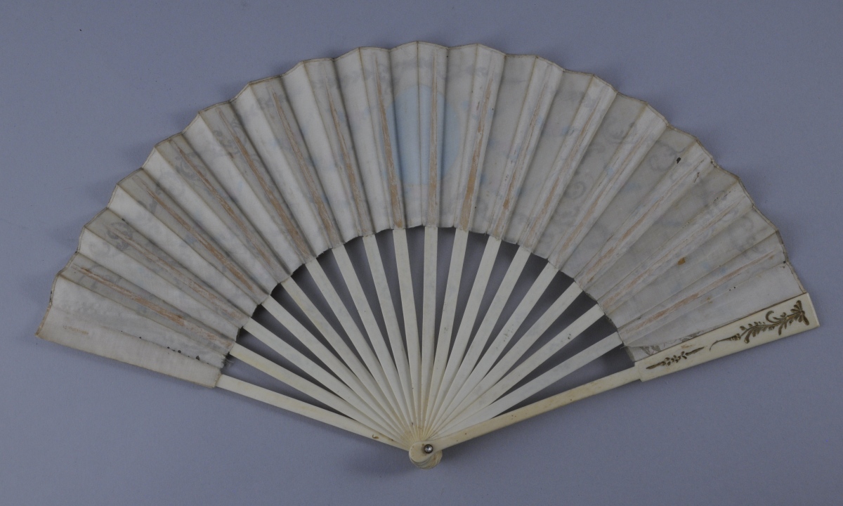 ÉVENTAIL plié. La feuille en soie peinte polychrome et or et brodée de sequins or. Décor dans un médaillon ovale d'un trophée d'instruments de musique dans un entourage de guirlandes de fleurs et de rinceaux. Monture en os ornée de rinceaux or. Le panache orné de deux pierres banches. XIXème. Haut. 22, Larg. 40 cm. (usures)