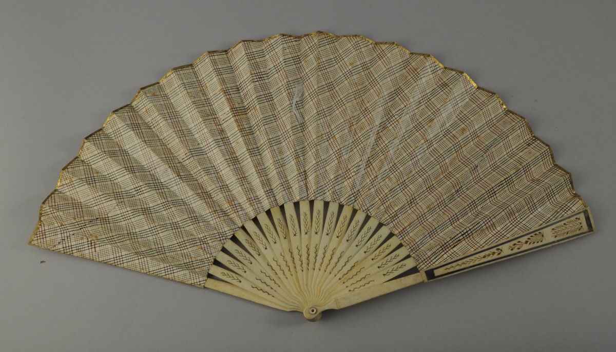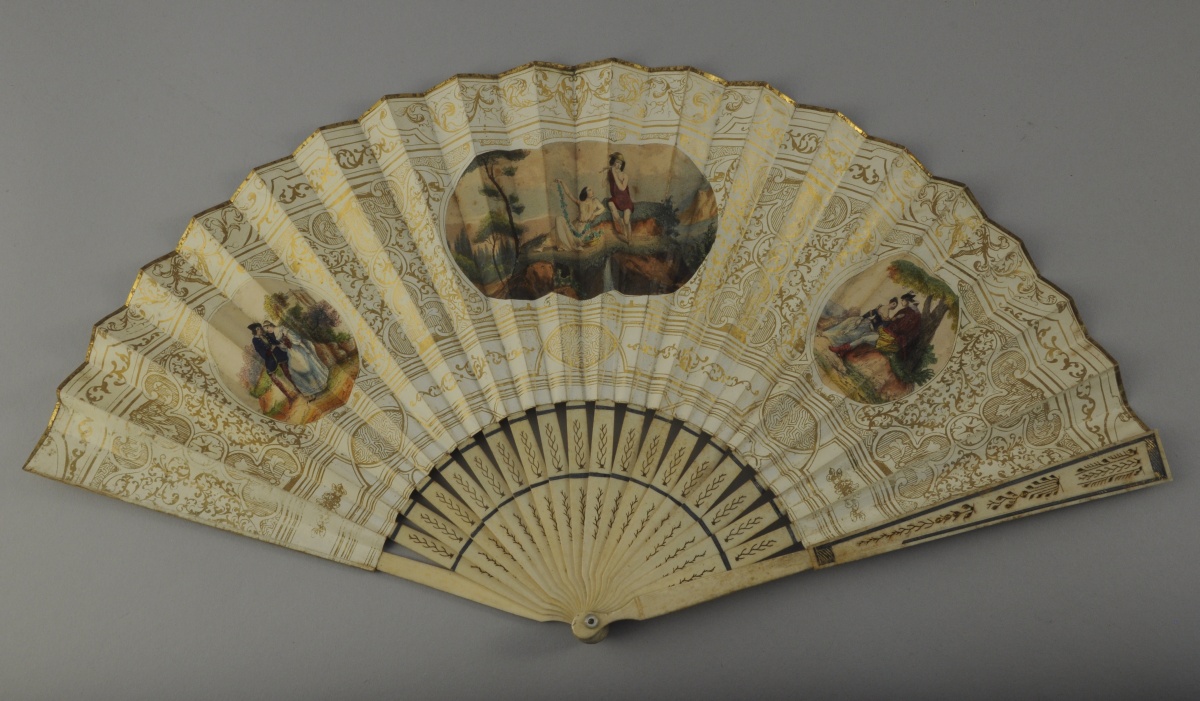 ÉVENTAIL plié. La feuille en papier rehaussé polychrome dans trois réserves de scènes galantes dont une antiquisante, dans un entourage de rinceaux feuillagés, mascarons et filets or. Croisillons en plein au revers. Monture en os ajourée de feuillages stylisés. Fin XIXème. Haut. 24, Larg. 47 cm. (usures)
