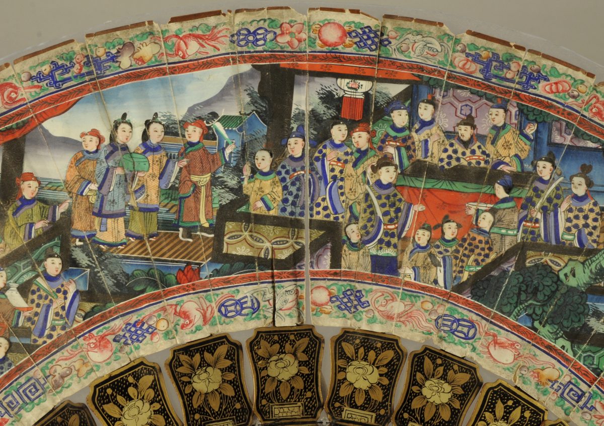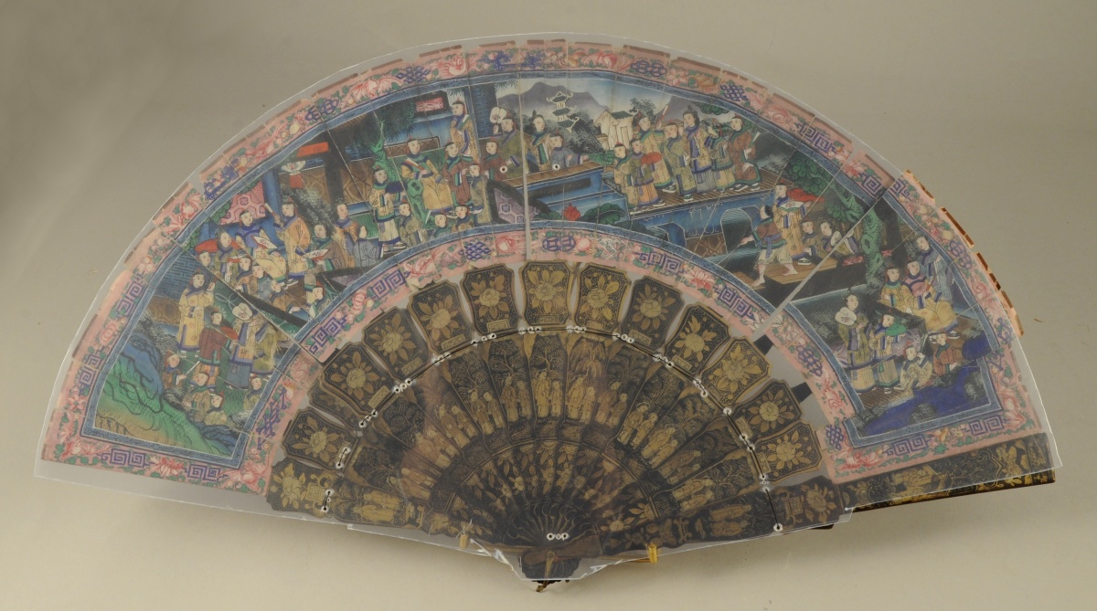 ÉVENTAIL en bois peint noir et or à l'imitation du laque de personnages dans un jardin et de fleurs. Feuillets à décor polychrome de scène de palais. Canton, XIXème. Haut. 28, Larg. 52 cm. (manque un feuillet)