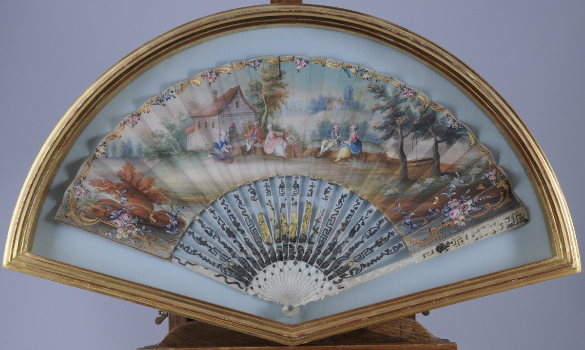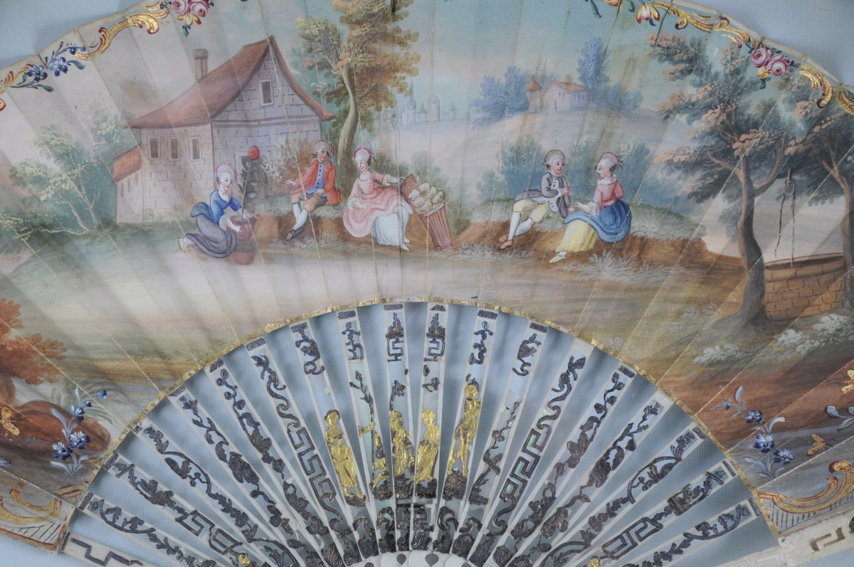 ÉVENTAIL plié. La feuille en papier peint à la gouache de scènes galantes près d'un puits dans un entourage de fleurs et de rinceaux. Monture en ivoire (?) ajourée de rinceaux fleuris et de personnages or et argent. Seconde moitié du XIXème. Dans un cadre en bois doré. Haut. 26, Larg. 47 cm (à vue). (manques, usures)