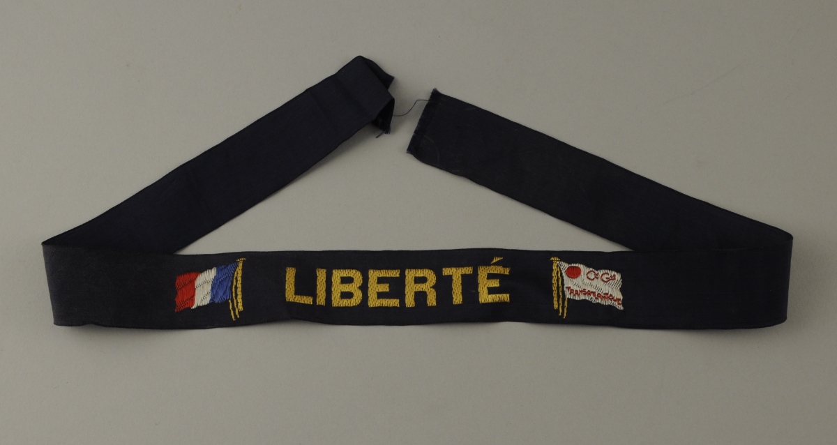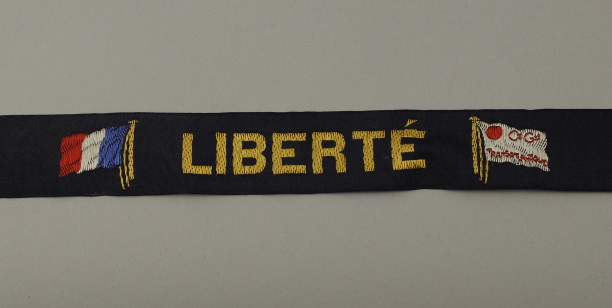 RUBAN du paquebot "Liberté" de la Compagnie Général Transatlantique. Il est brodé en lettres or du nom du navire flanqué, à gauche, du drapeau français et à droite, du drapeau de la compagnie eux mêmes brodés.