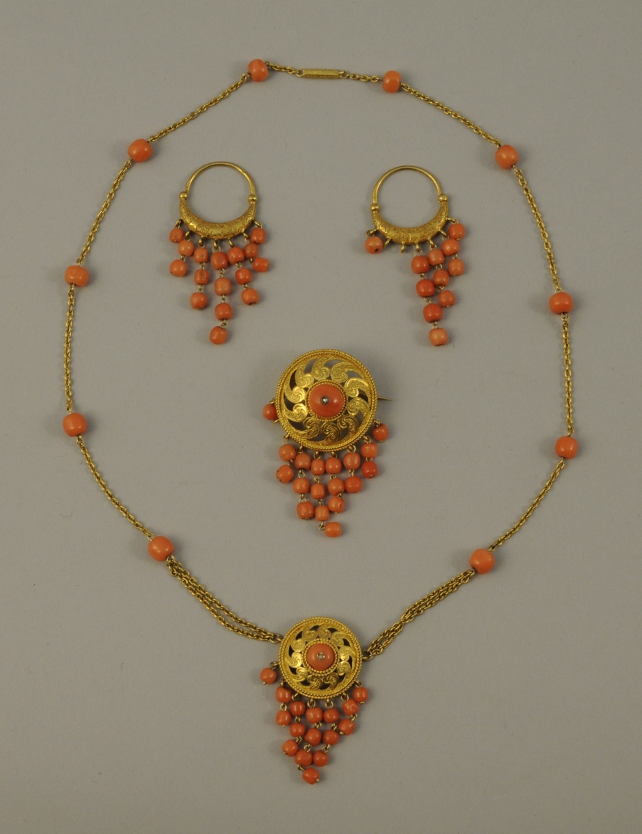 PARURE en or jaune, ornée de boules de corail, comprenant un collier draperie, une broche et une paire de boucles d'oreilles.