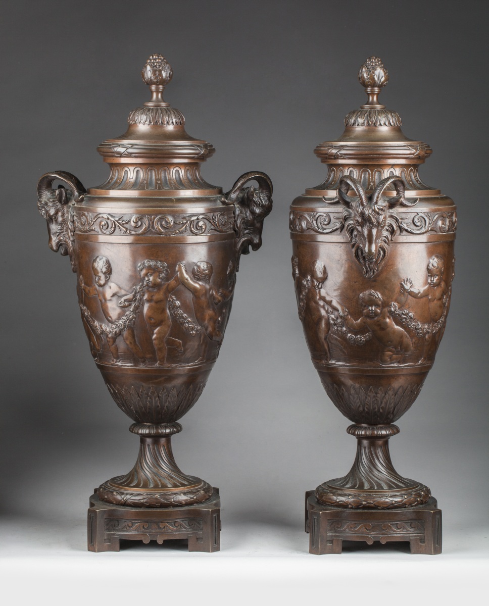 Paire de VASES COUVERTS de forme ovoïde en bronze patiné. La panse est ornée d'un bas-relief d'après Clodion figurant une farandole d'amours à la guirlande de fleurs. Les anses adoptent la forme d'une tête de bélier. Le fretel en graine. Les contours du piédouche à cannelures torses formés de tors de laurier. Ils reposent sur une base quadrangulaire ornées de postes.