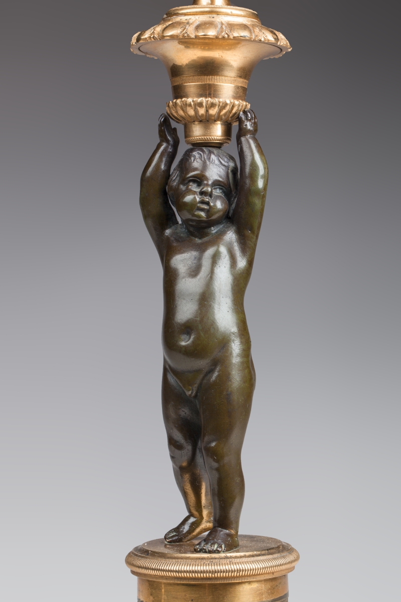 Paire de CANDÉLABRES à quatre lumières en bronze doré et bronze patiné. Bras de lumière adoptant la forme de rinceaux feuillagés. Ils reposent sur une toupie ornée de feuilles d'acanthe et godrons. Fûts figurés par un putto. Base cylindrique à décor appliqué de deux putti jouant avec un oiseau, d'une frise de câble et d'une frise d'oves et dards. L'ensemble repose sur une base carrée.
