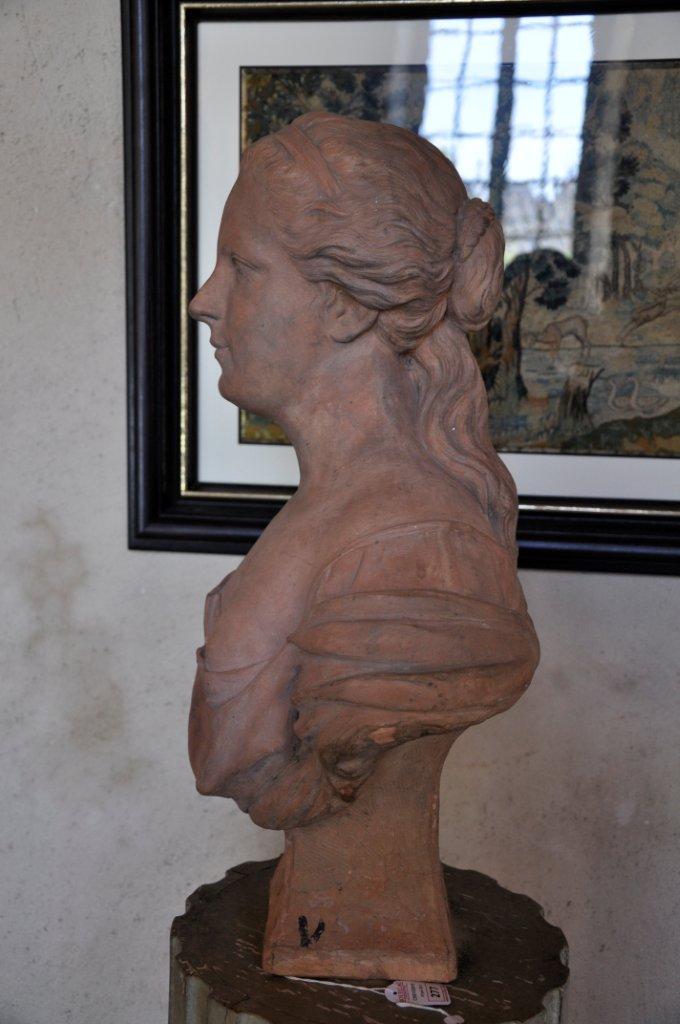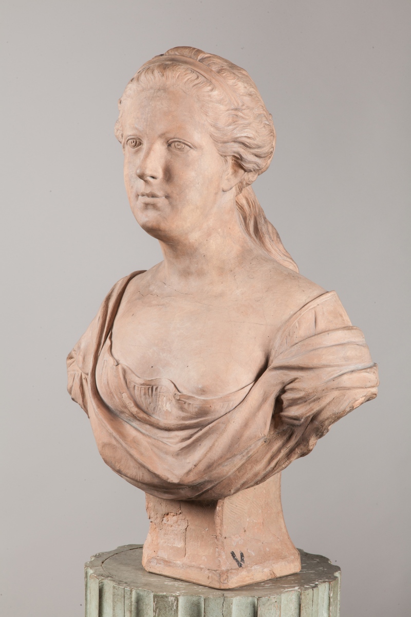 À la demande de grands commanditaires, les portraits sculptés deviennent au XVIIIe siècle des chefs d'oeuvre, à l'égal de la sculpture monumentale. La Marquise de Pompadour prend sous son aile Jean-Baptiste Pigalle, qui lui livre un premier portrait en buste en 1751. Travaillant également pour le château des Ormes appartenant au marquis d'Argenson, Pigalle représente à nouveau la Pompadour en 1753. Elle est en pied, dans un pendant à la sculpture de Louis XV, pour le parc du château de Bellevue, dans une figure allégorique intitulée "L'amitié sous les traits de Mme de Pompadour", aujourd'hui au musée du Louvre. Les cheveux noués de la femme sur ce buste rappellent ceux de cette oeuvre : "La physionomie est fine et gracieuse ; on y reconnait à la fois l'expression de tendresse et celle de l'esprit le plus délicat ; ses cheveux décorent les tempes de leurs ondulations ; ils sont ramenés à l'aide d'un léger ruban qui passe sur le devant de la tête, formant une couronne nattée, et tombent par derrière en flots élégants. " in Prosper Tarbé, "La vie et les oeuvres de Jean-Baptiste Pigalle", éd. Renouard, Paris, 1859, pp. 57, 58.