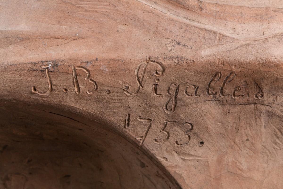 Terre cuite estampée, signée sur le socle "J B Pigalle" et datée "1753".