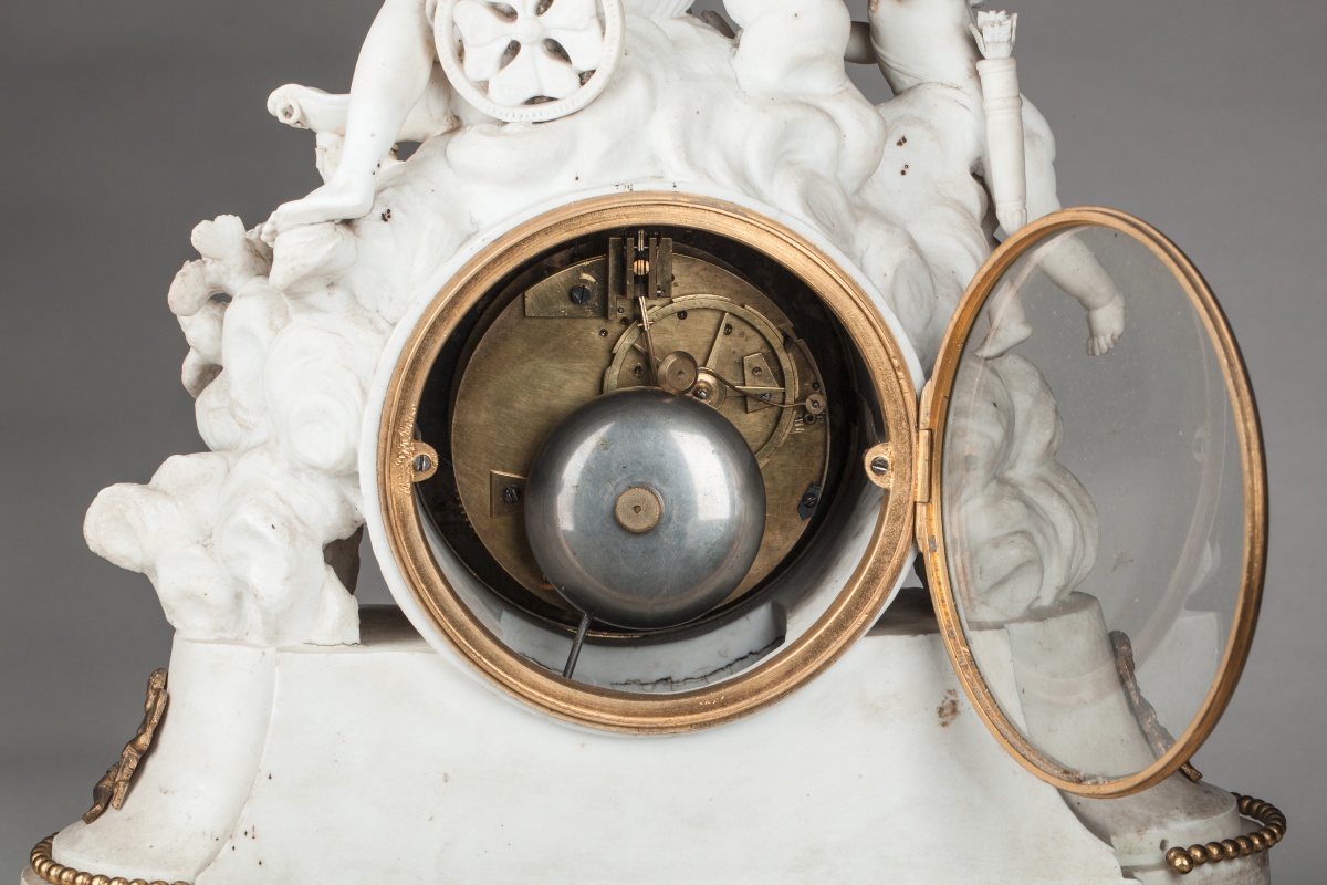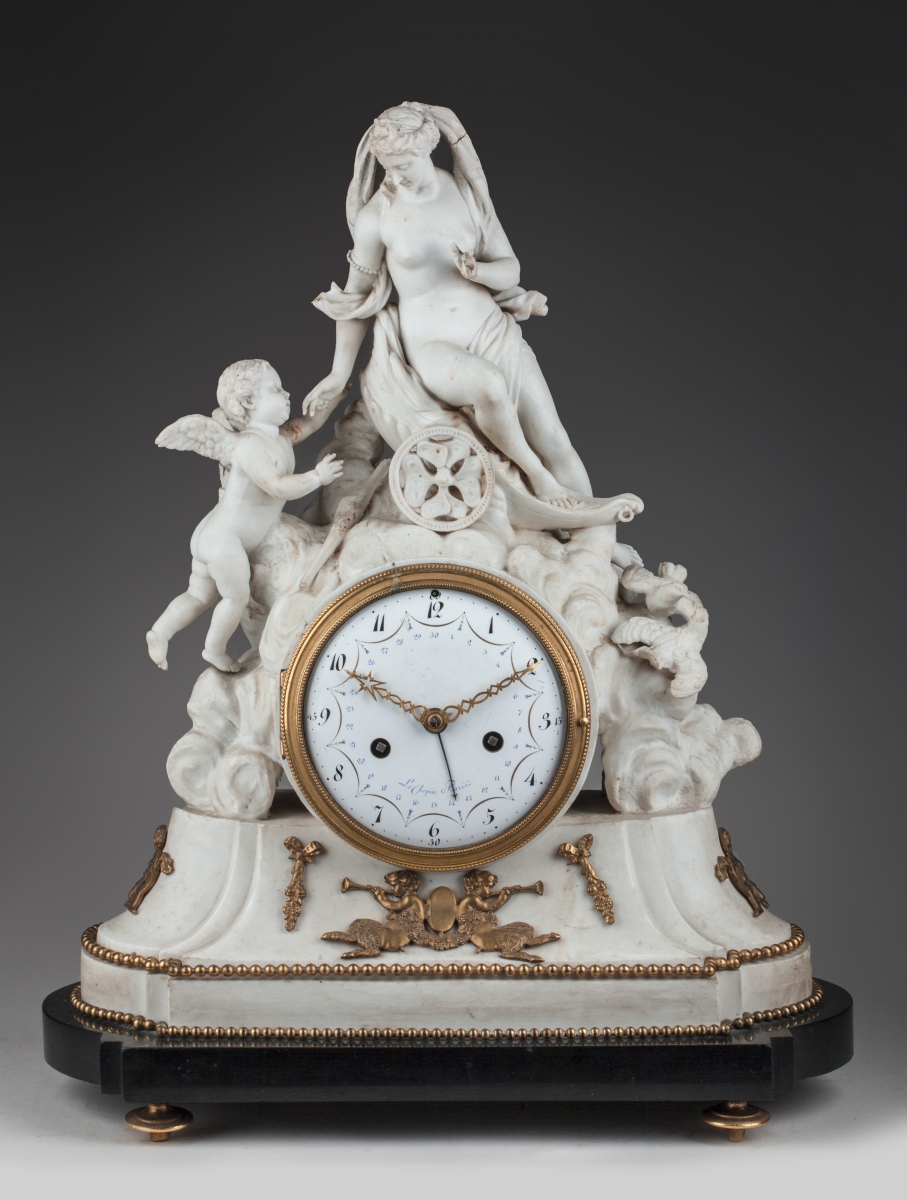 PENDULE en biscuit et bronze doré représentant Vénus sur son char tendant les bras vers Cupidon ayant posé son arc. Un couple de colombes se becquette à ses pieds. Le char, posé au sommet d'un nuage, adopte la forme d'une coquille, ses roues sont en ailes de papillons.