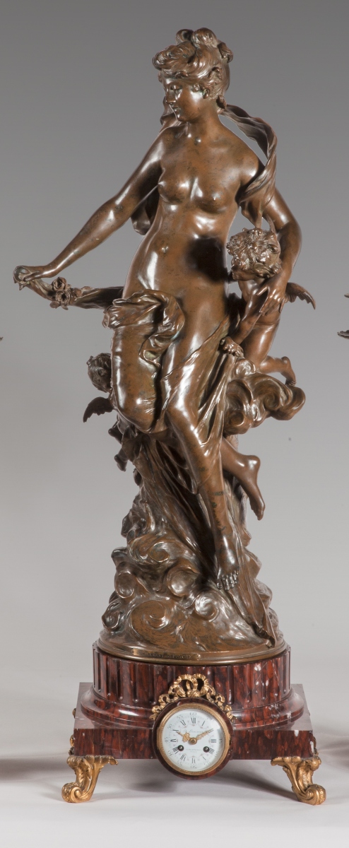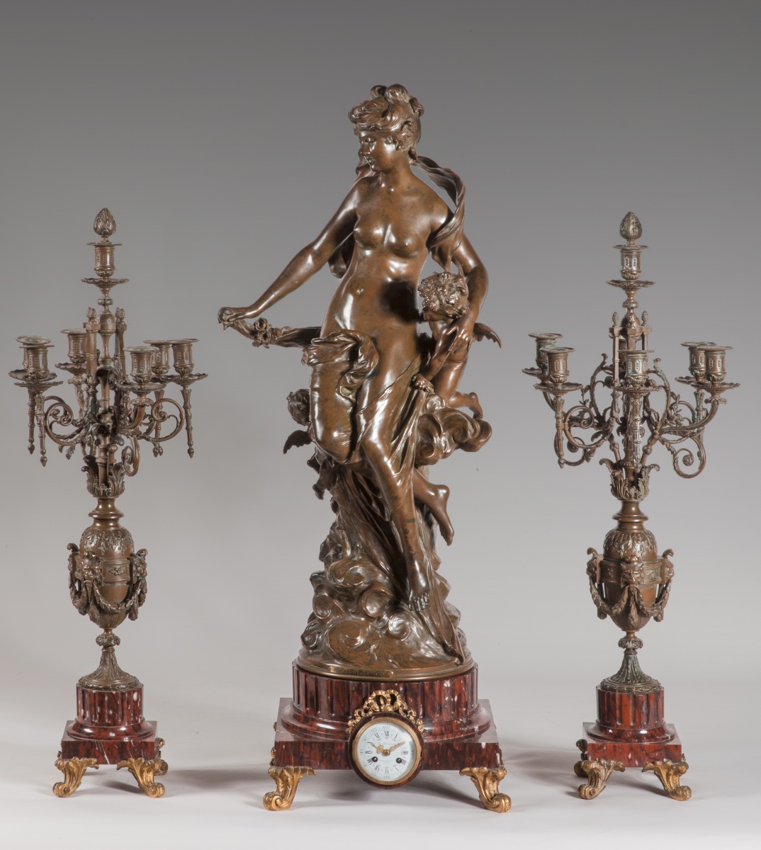 GARNITURE de CHEMINÉE comprenant une pendule et une paire de riches girandoles à sept lumières en bronze patiné, sur des socles de marbre griotte rouge. La pendule est surmontée d'une statue en bronze patiné d'Auguste MOREAU (1834-1917) représentant "Enlèvement de Psyché".