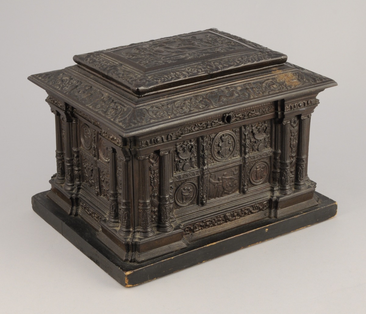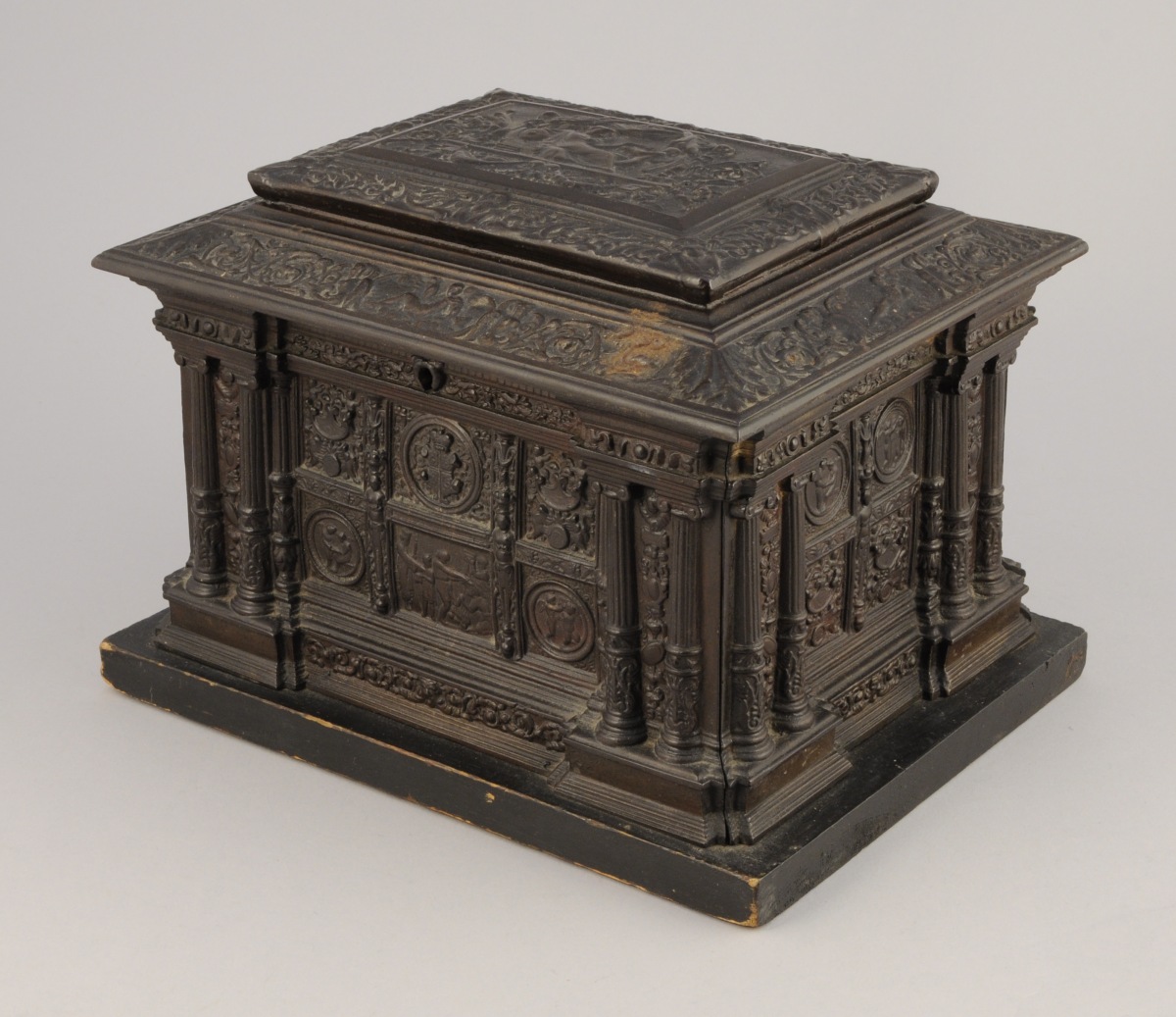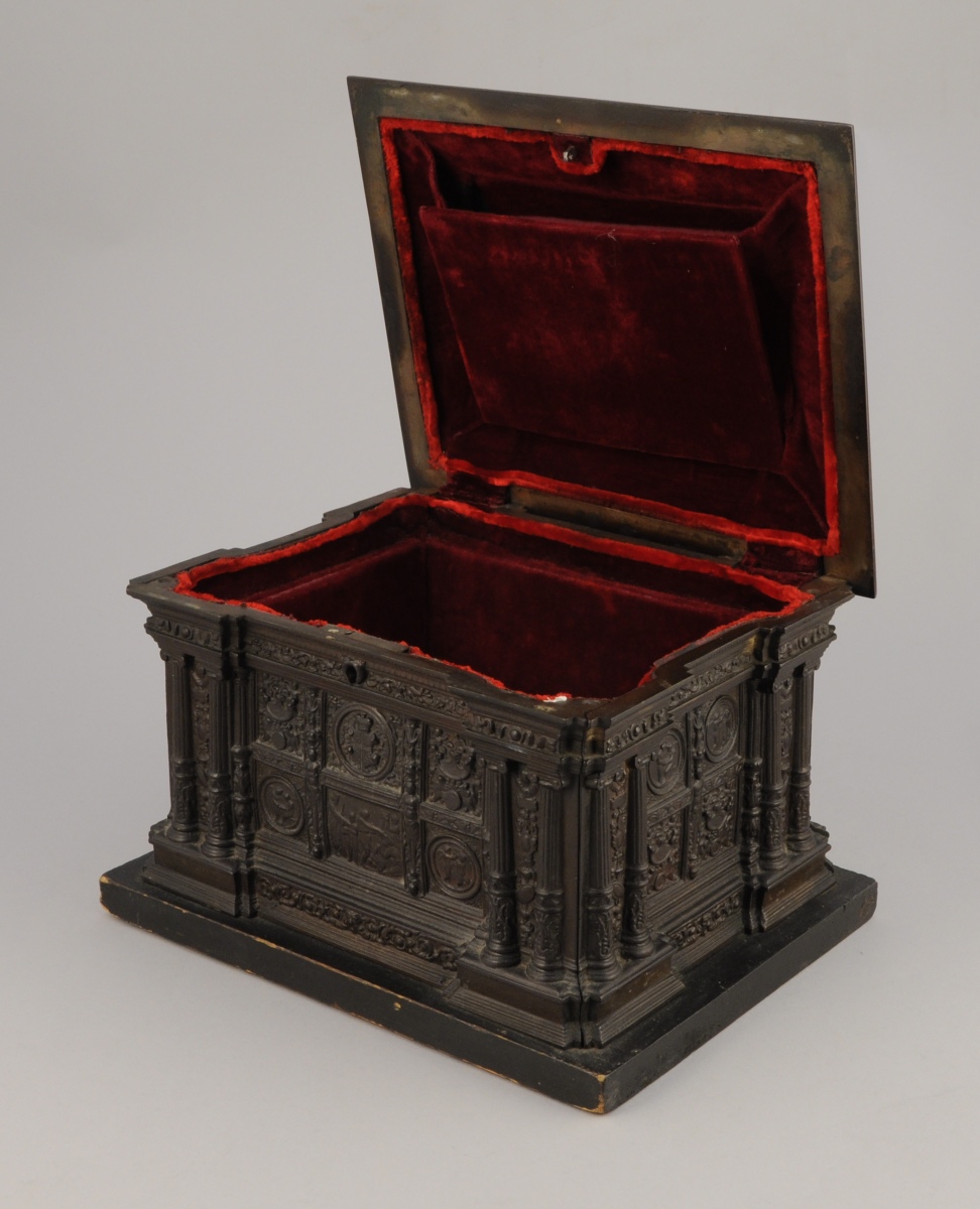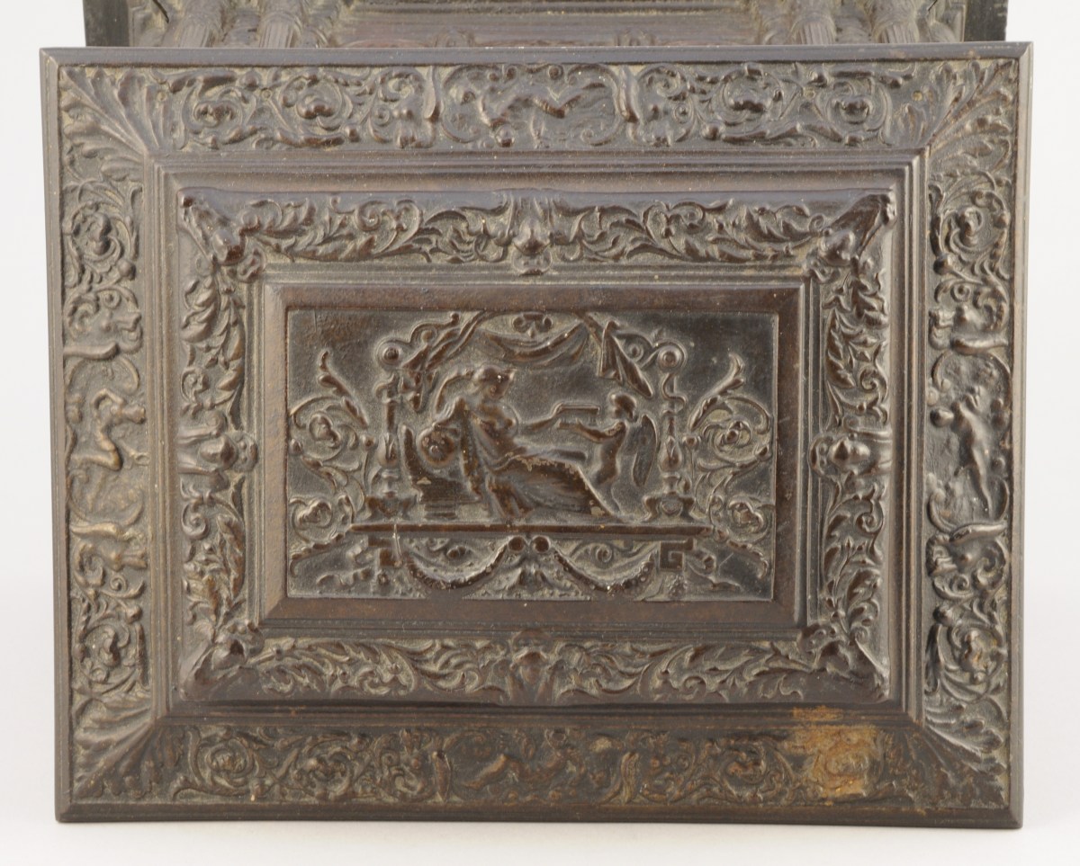 COFFRET rectangulaire en bronze à décor architecturé. Chaque côté est encadré de deux demi-colonnes supportant un entablement. Il est orné sur toutes ses faces de scènes, blasons, trophées et feuillages cloisonnés inspirés de l'Antiquité. Le couvercle à ressaut à décor d'un amour offrant un petit temple à une divinité. Il repose sur une base en bois noirci.