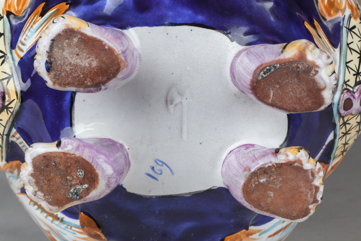 CACHE POT de forme mouvementée en faïence. Décor polychrome dans deux réserves d'une salamandre, emblème de François Ier, et d'un cygne à la flèche, emblème de Claude de France, couronnés et flanqués de fleurs de lys. Entourage d'écus, coquilles, fleurettes, rinceaux et filets. Anses en forme de protomés de lions. Le bord mouvementé souligné d'un filet bleu. Il repose sur quatre pattes de lions. Marque à la hache en creux au revers.