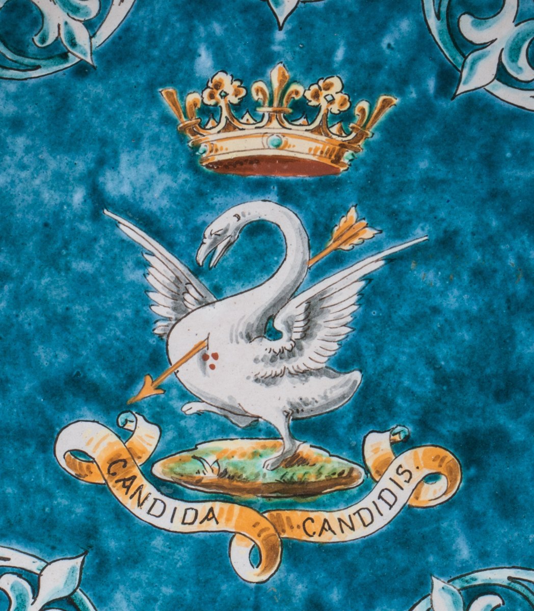 SALADIER circulaire en faïence à décor polychrome sur fond turquoise du cygne de Claude de France, dans un entourage de lambrequins et de fleurs de lys, avec la devise "Candida Candidis" (pure parmi les pures).