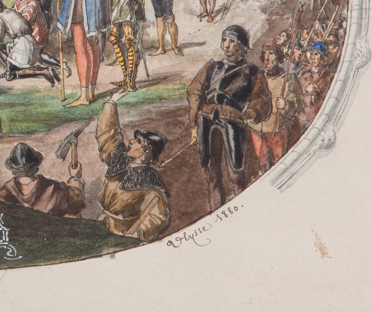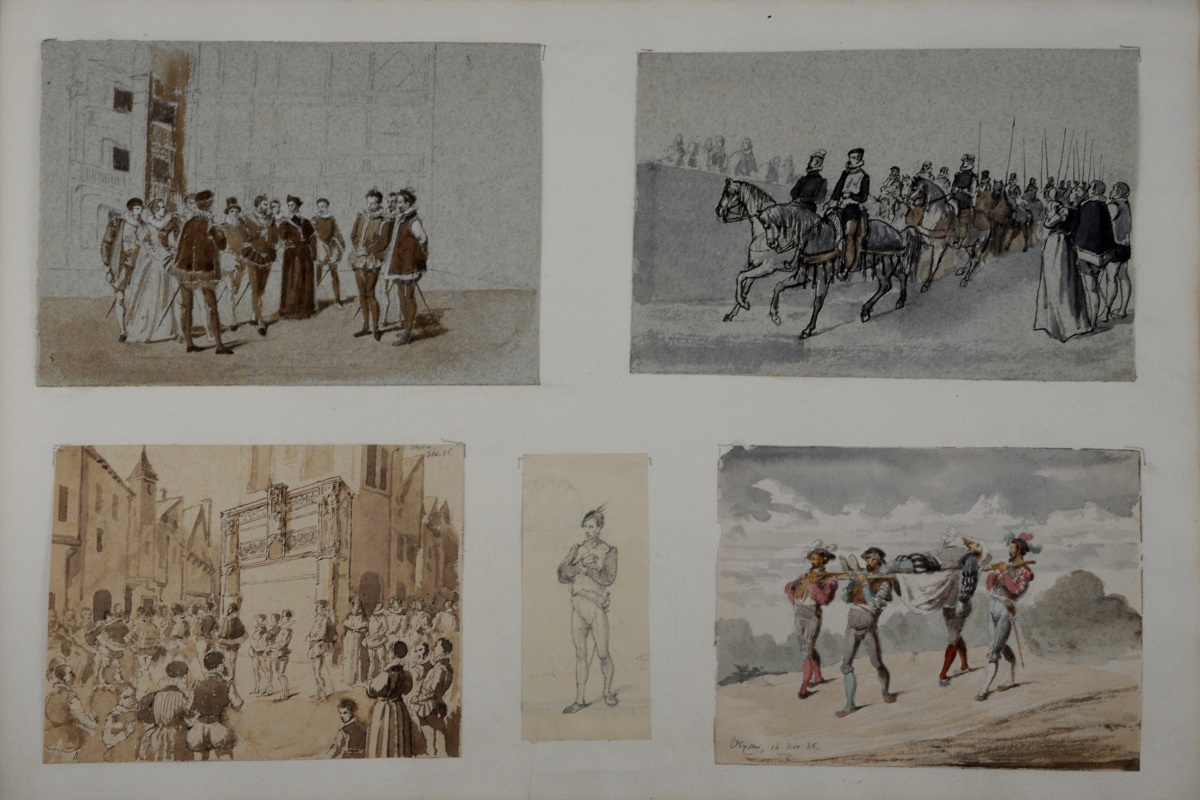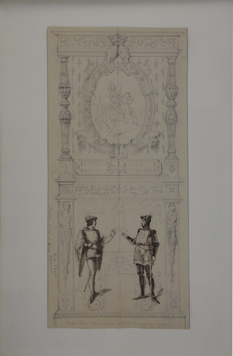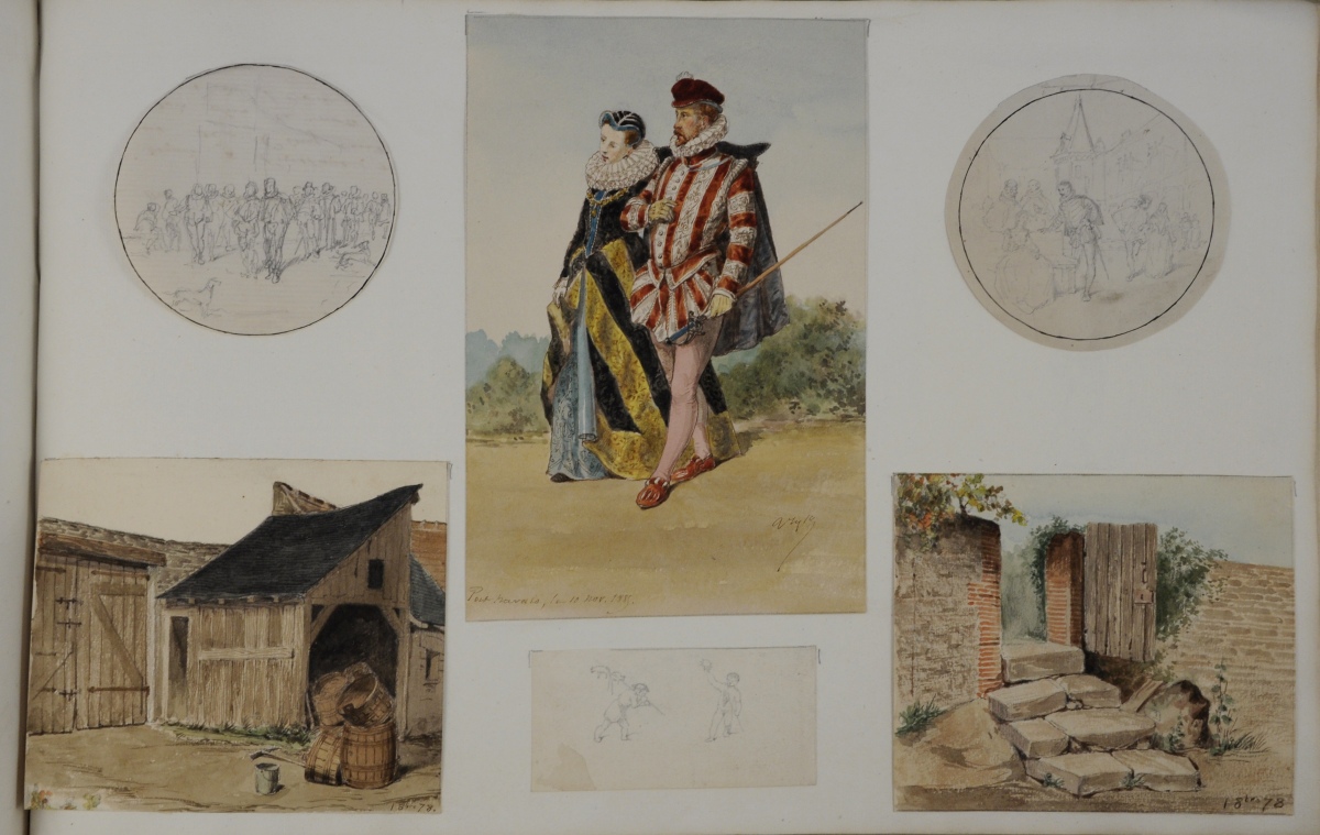 Recherches et études de costumes, architecture, scènes historiques de la Renaissance principalement à Blois.