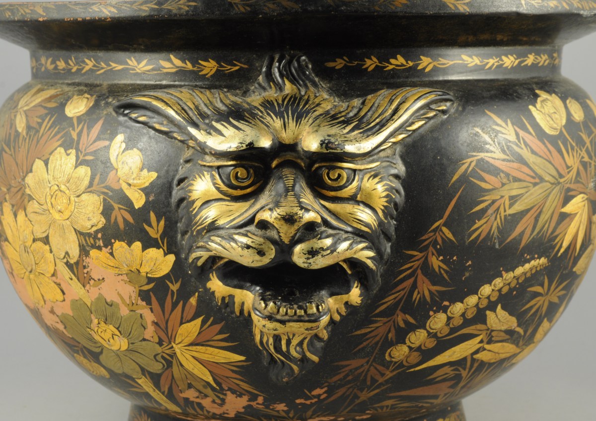 Céramique à l'imitation du laque à décor japonisant de chrysanthèmes or sur fond noir. Prises en forme de tête de félin monstrueux.