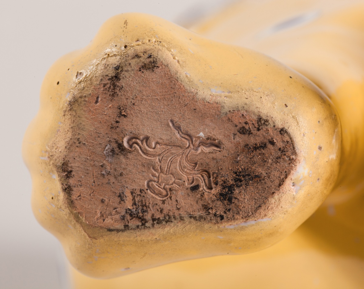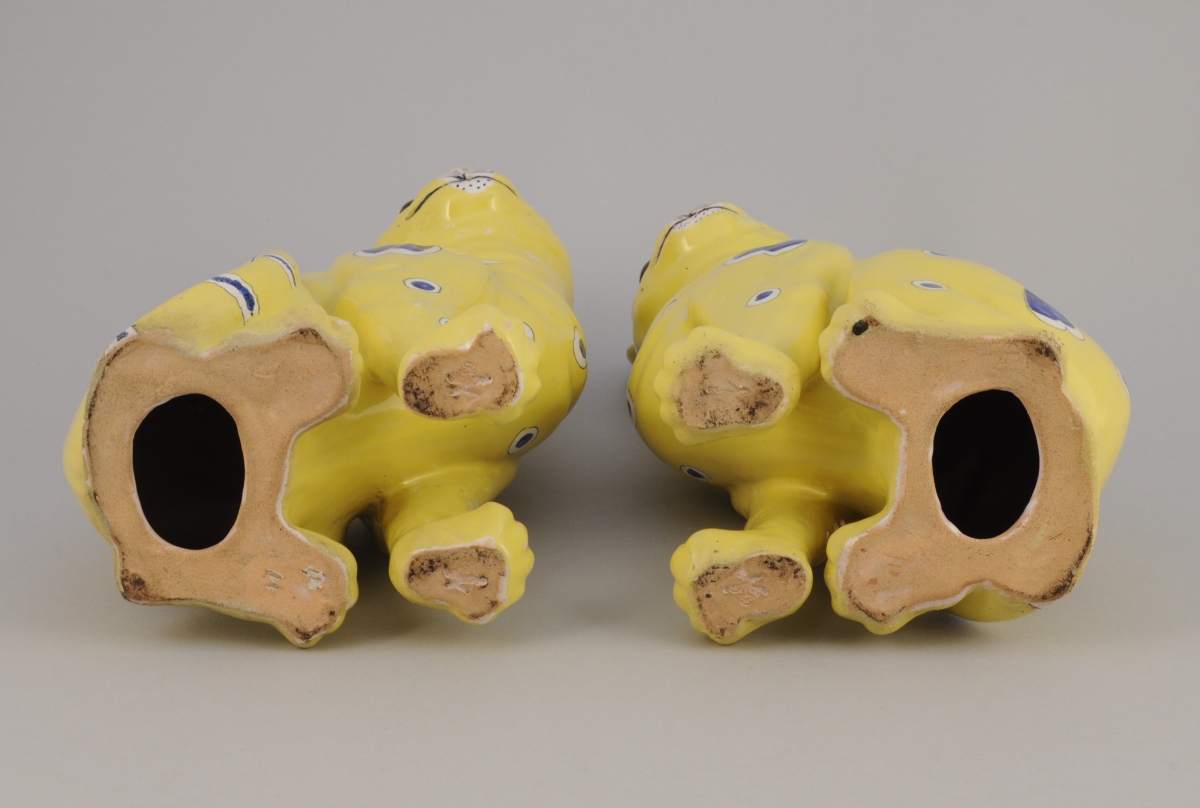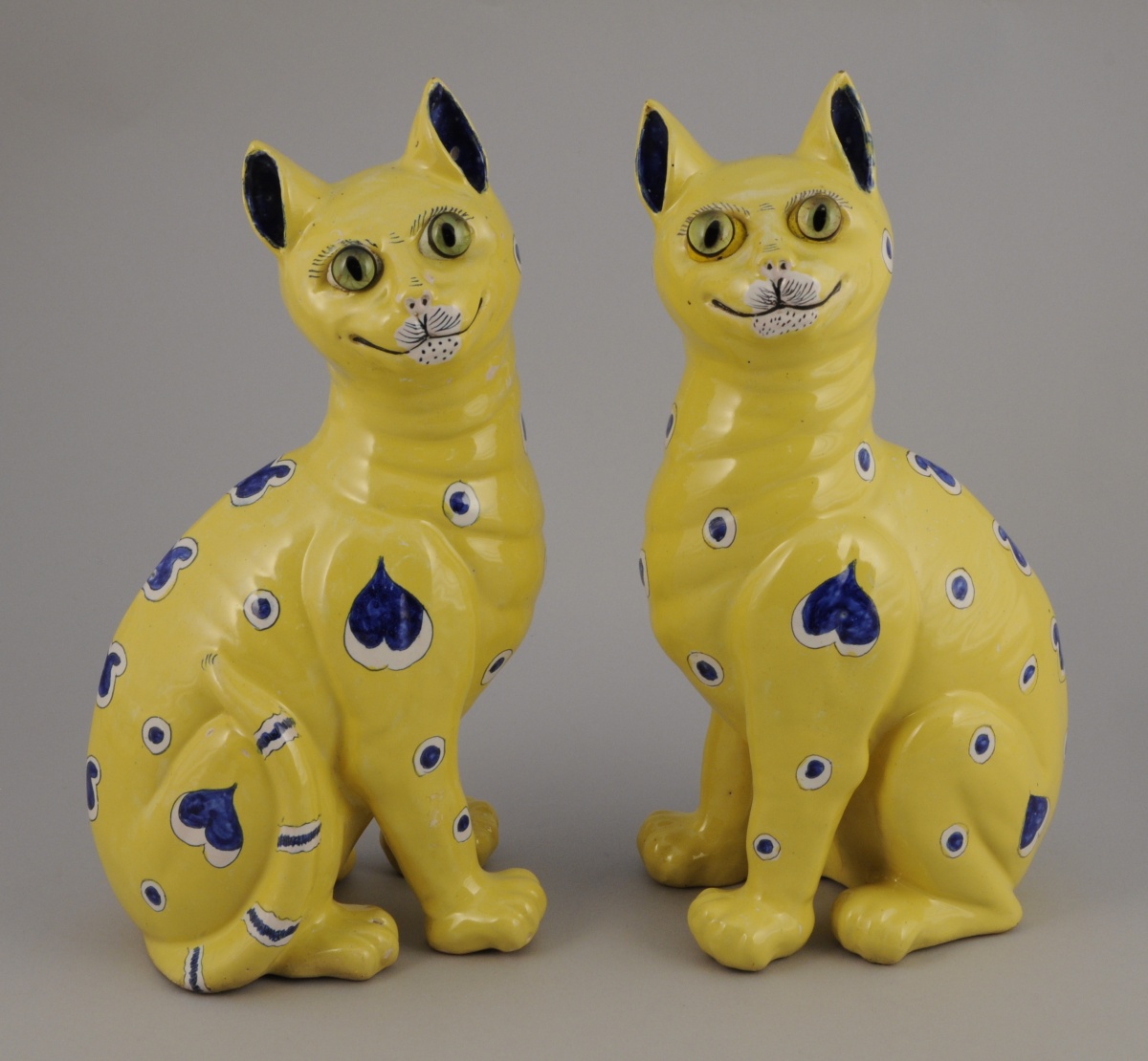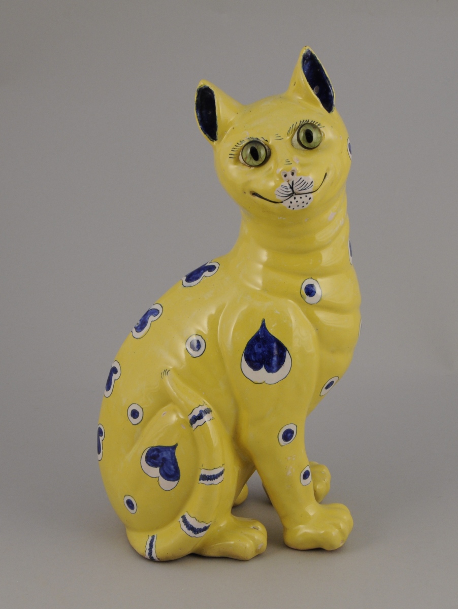 Faïence émaillée jaune à décor bleu et blanc de coeurs et de cercles. Les yeux appliqués verts en sulfure. Marque en creux sous chaque patte avant.