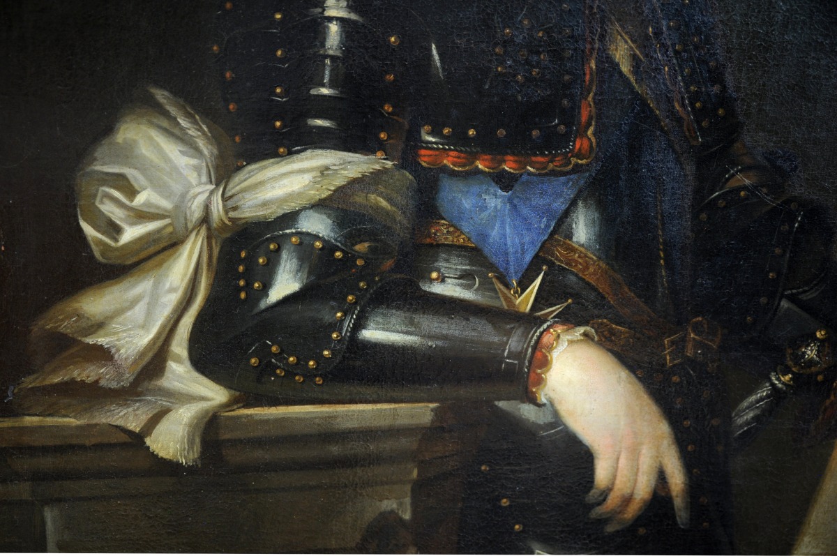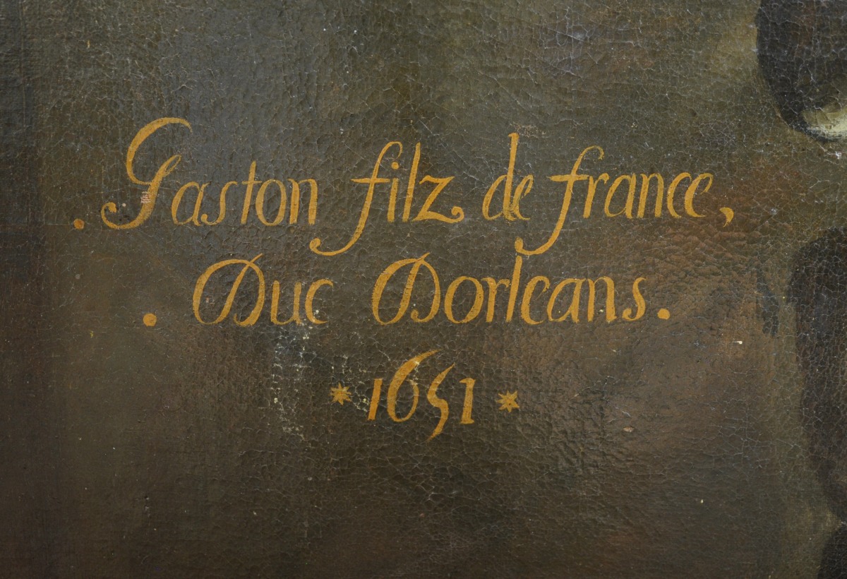 Notre portrait représente Gaston de France, duc d'Orléans (1608-1660), fils d'Henri IV et de Marie de Médicis, frère de Louis XIII. Représenté en armure, portant le bâton de commandement de la main gauche, le bras droit appuyé sur un socle de pierre portant l'inscription: "Gaston. Fils de France. Duc d'Orléans.1651."