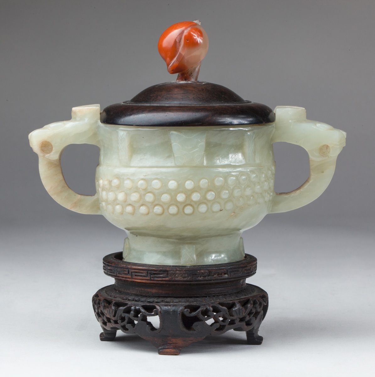 Couvercle en bois avec une prise en agate en forme de pêche de longévité. (éclat).