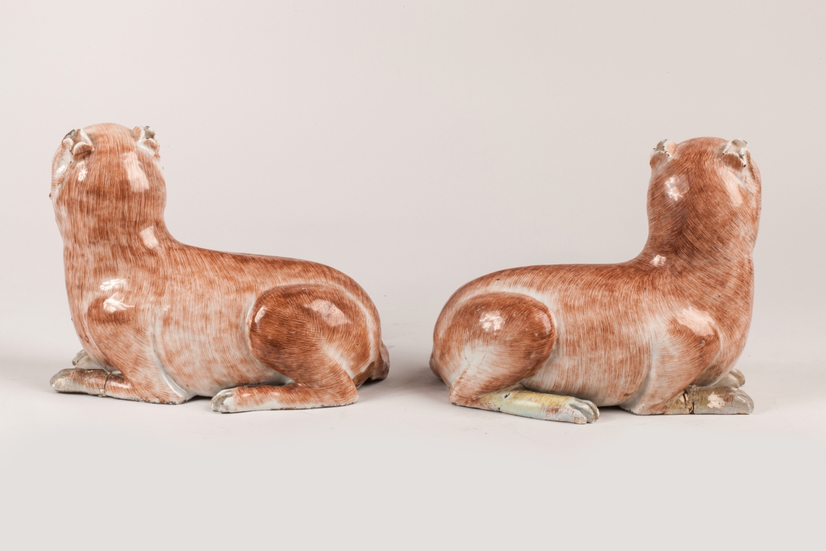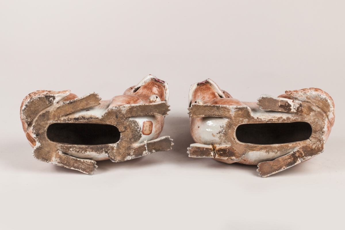 PAIRE DE CHIENS couchés en porcelaine à décor polychrome au naturel.