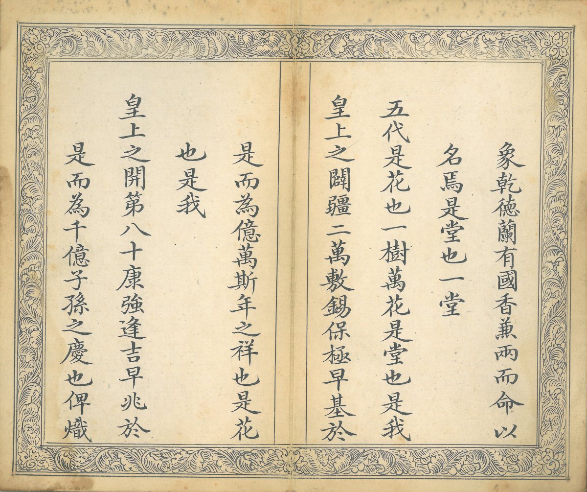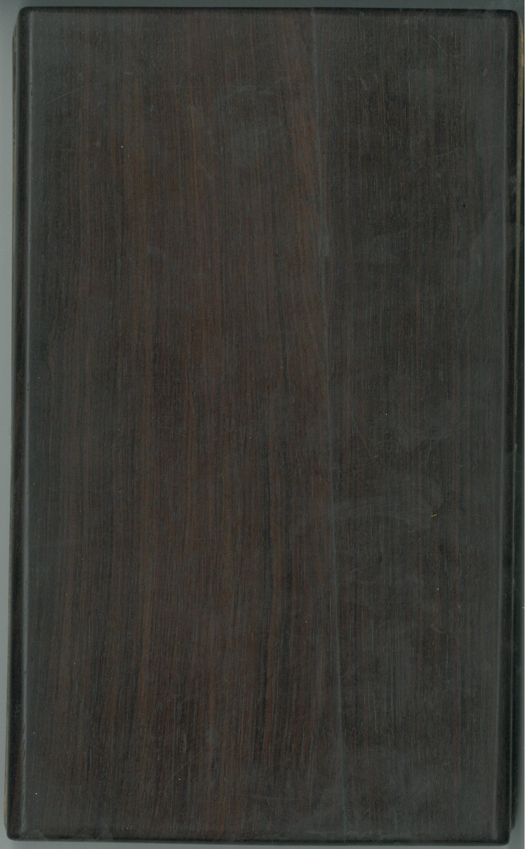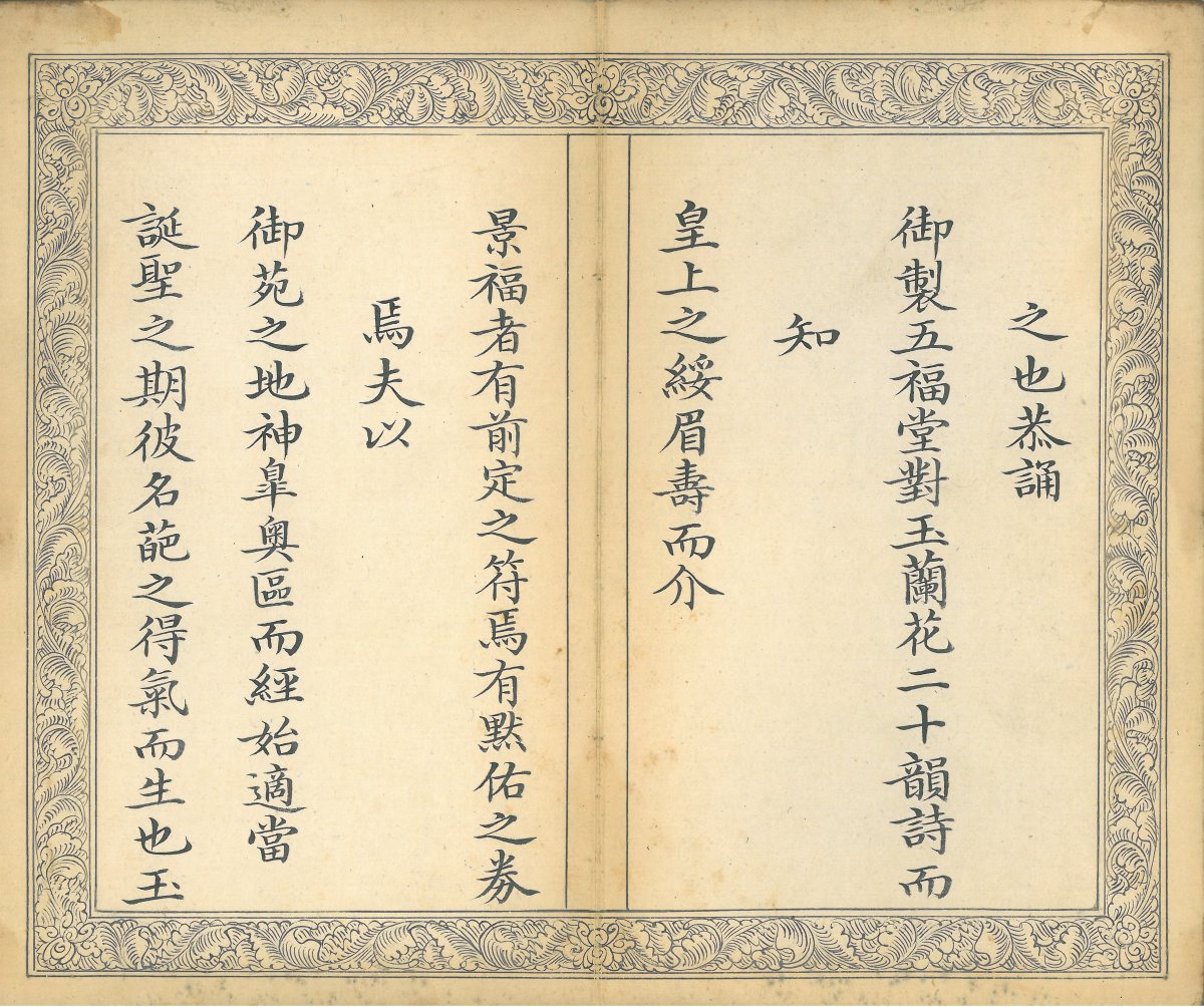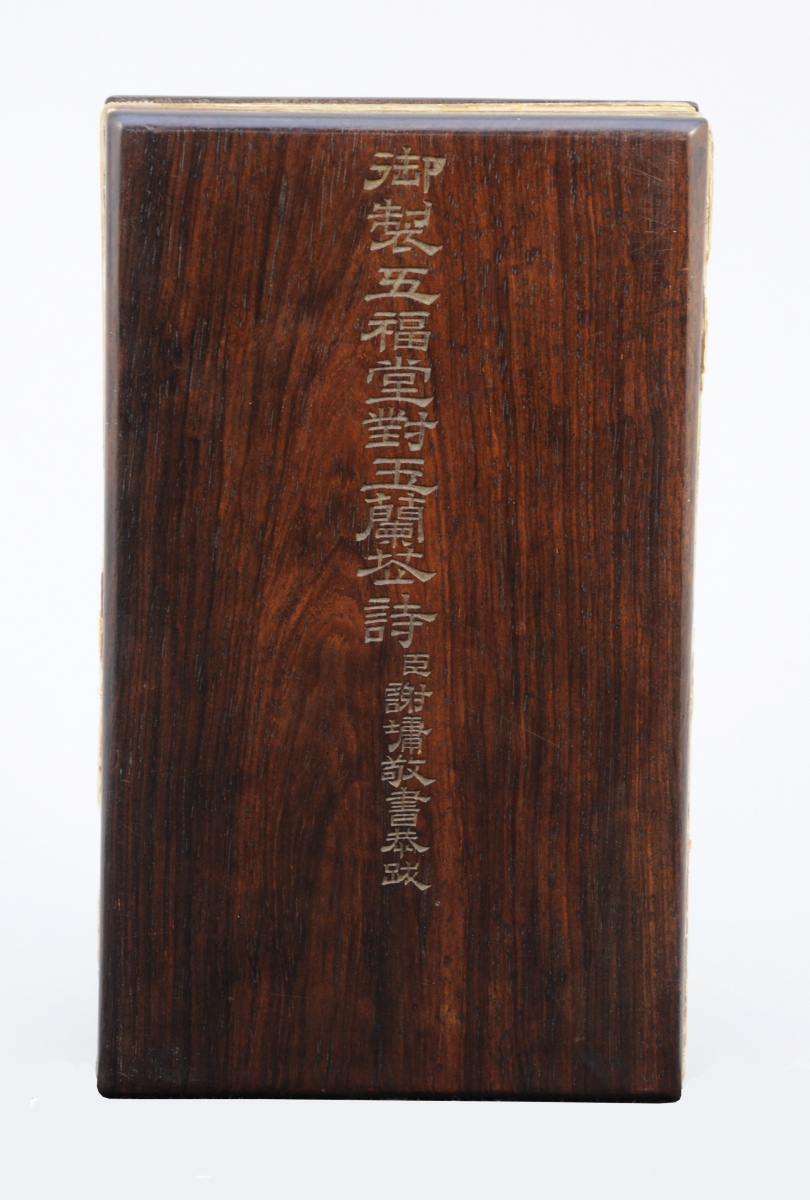 ALBUM avec la couverture en zitan comportant le titre "Yu zhi wu fu tang dui wu yu lan jian shi" comprenant un poème de Qianlong en l'honneur des magnolias avec les compliments du ministre Xie Yong. Les premières pages à décor à l'encre noire et or de chauves-souris parmi les nuages. Le poème entouré d'une bordure de feuilles d'acanthe. Le poème écrit en zhuanshu.