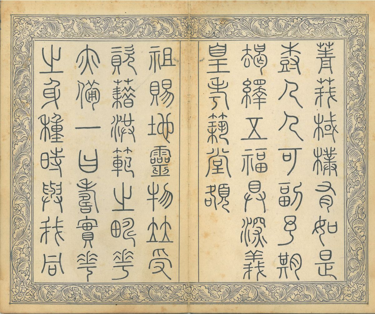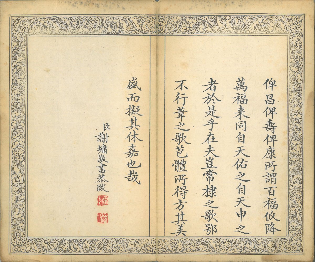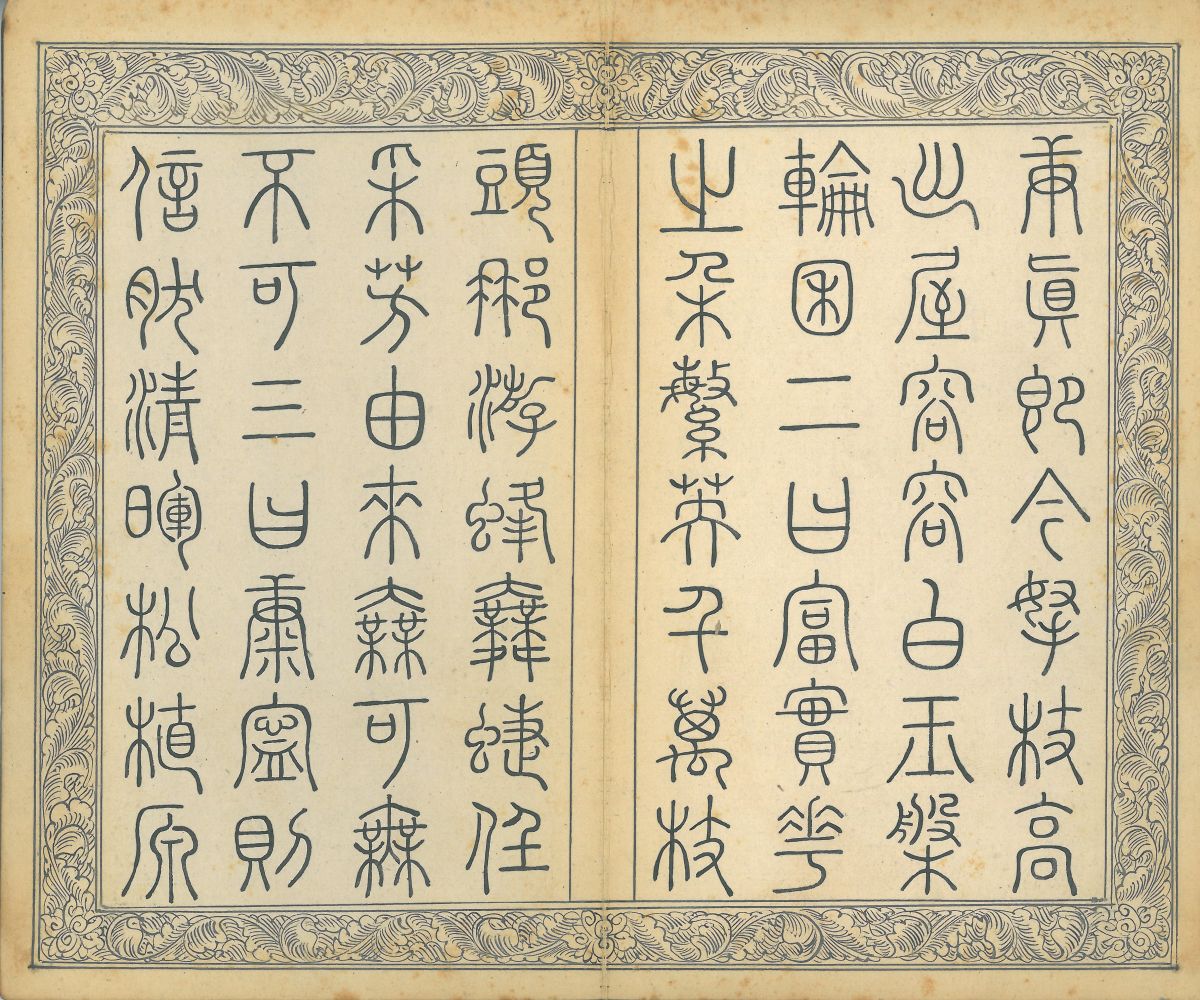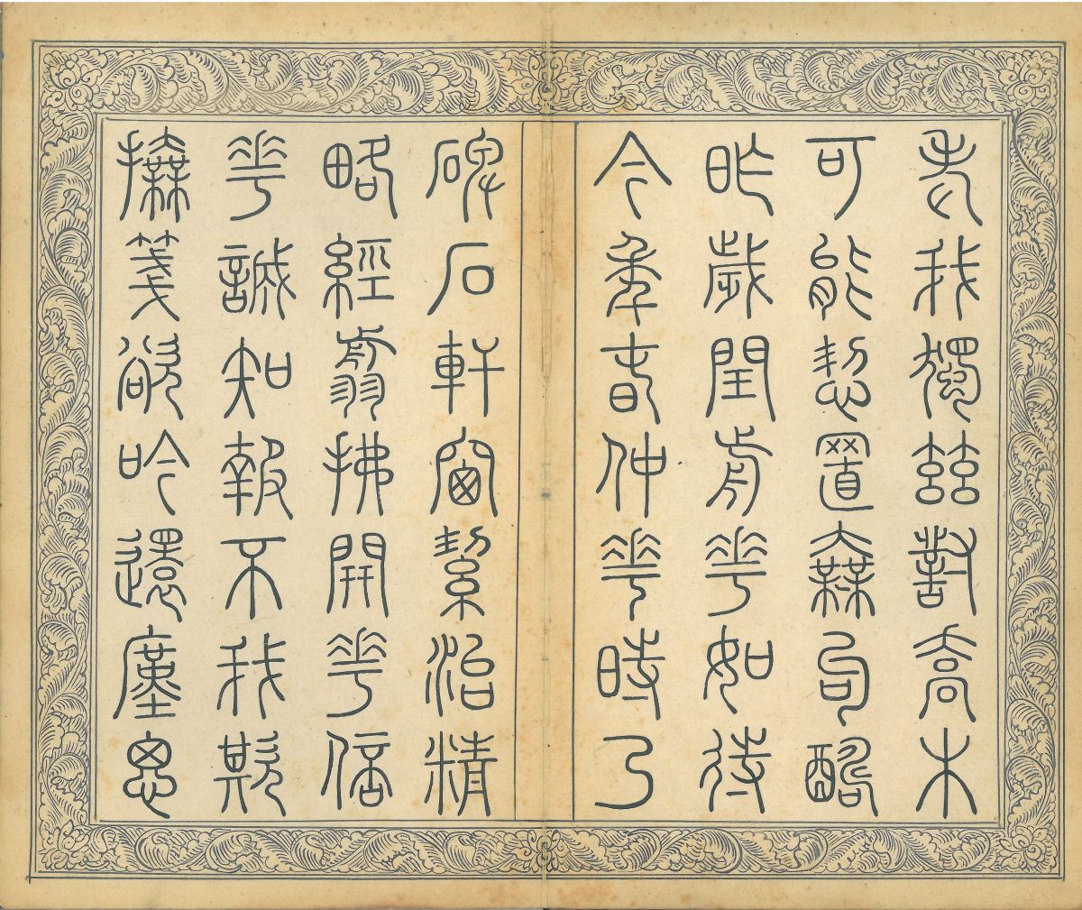 ALBUM avec la couverture en zitan comportant le titre "Yu zhi wu fu tang dui wu yu lan jian shi" comprenant un poème de Qianlong en l'honneur des magnolias avec les compliments du ministre Xie Yong. Les premières pages à décor à l'encre noire et or de chauves-souris parmi les nuages. Le poème entouré d'une bordure de feuilles d'acanthe. Le poème écrit en zhuanshu.
