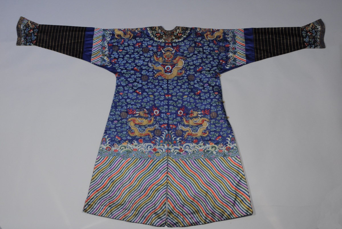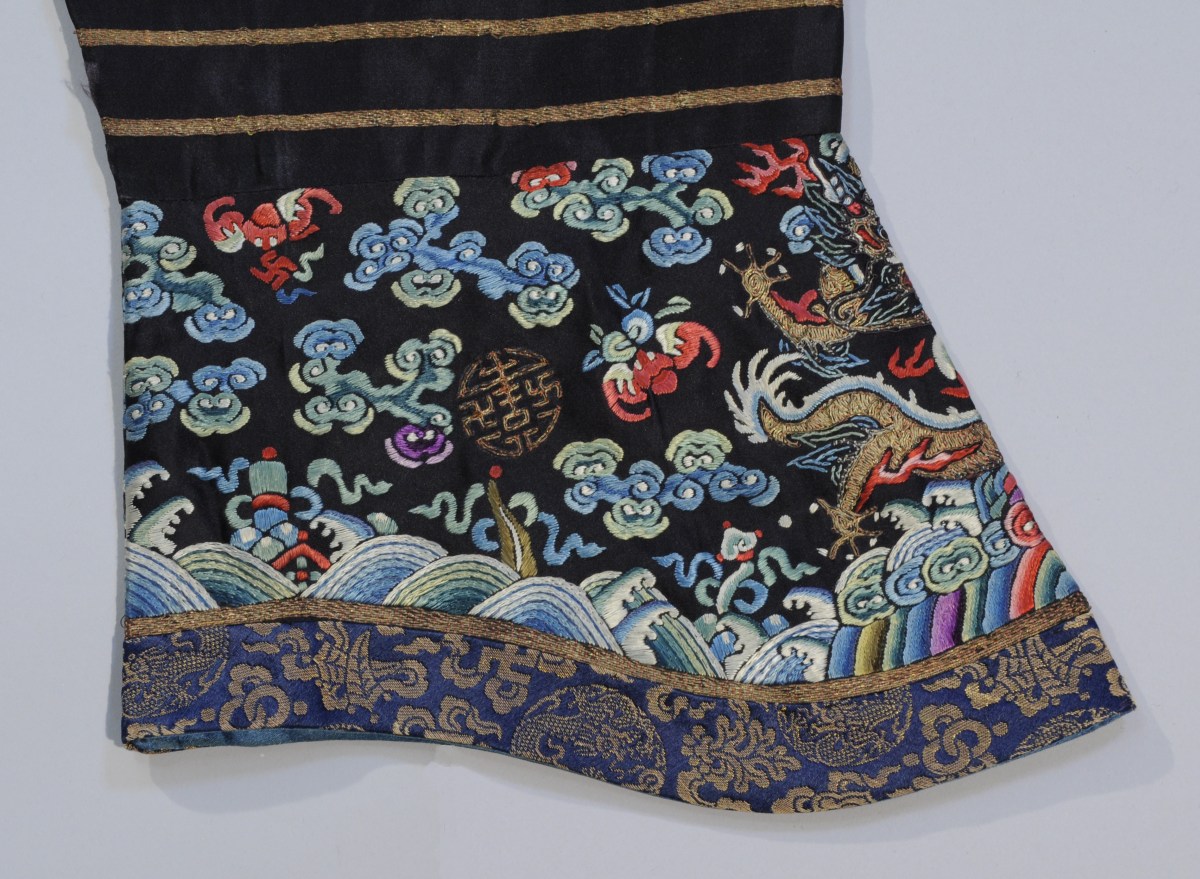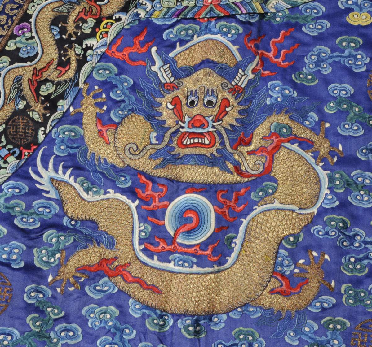 ROBE DRAGON en soie bleue à décor brodé de neuf dragons à cinq griffes pourchassant la perle sacrée au-dessus des flots parmi les nuages et les caractères "shou" stylisés.
