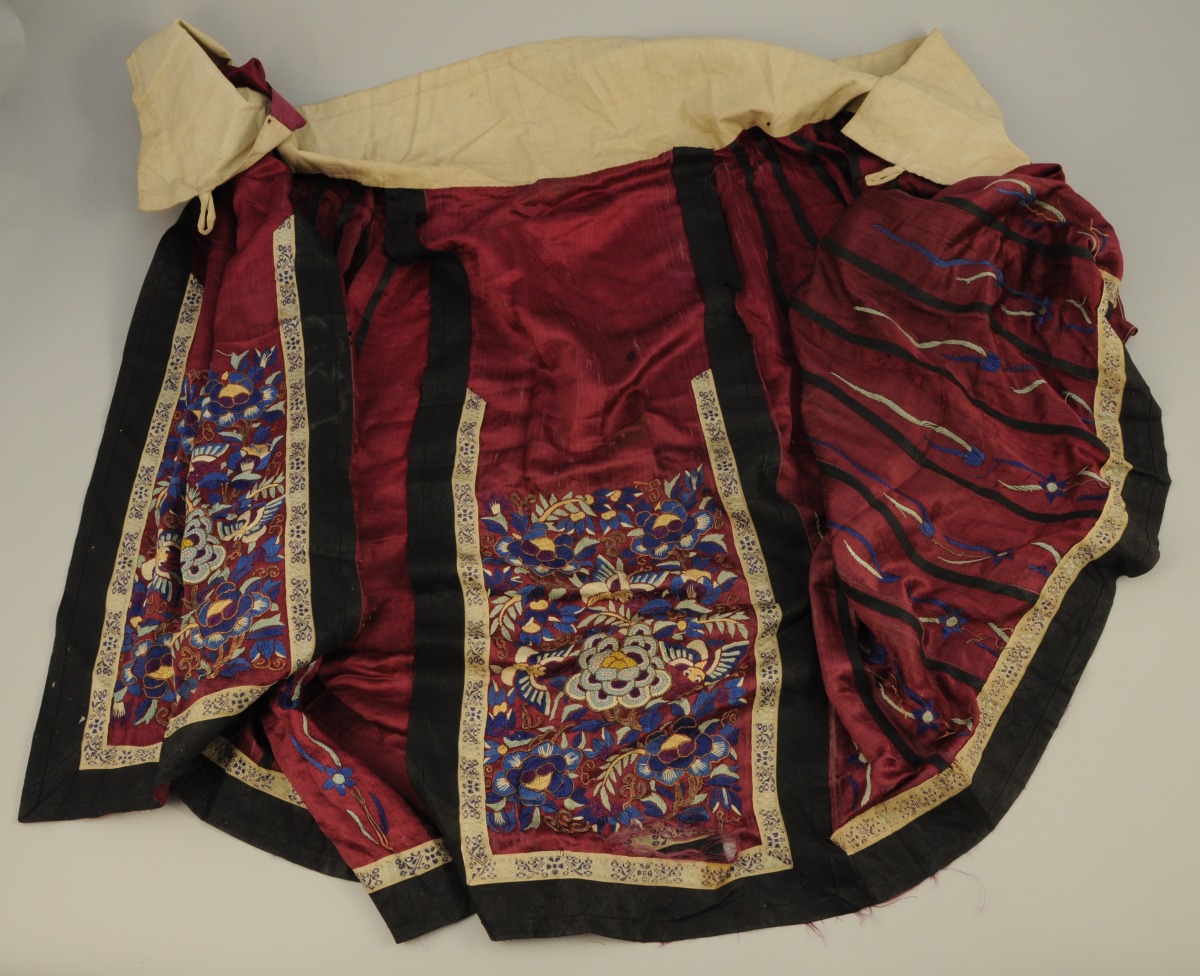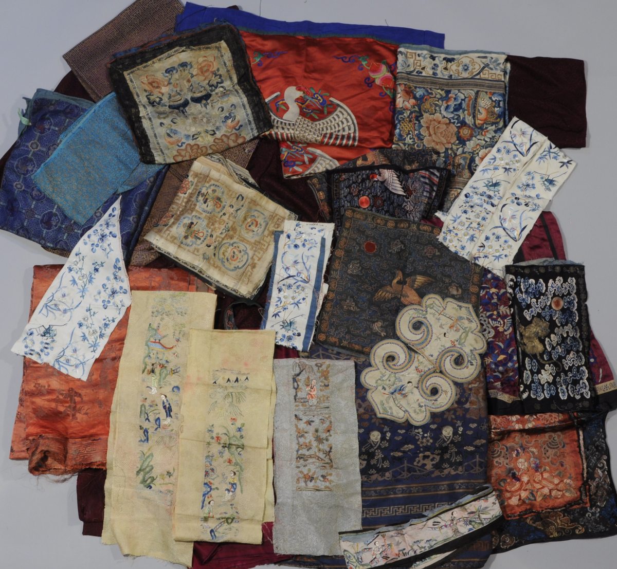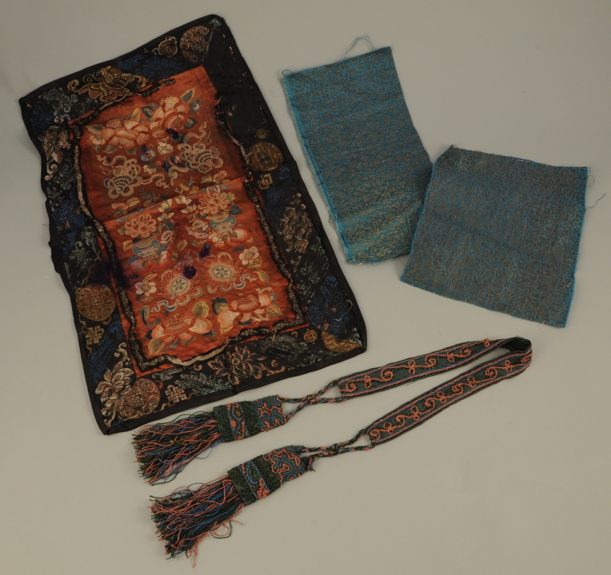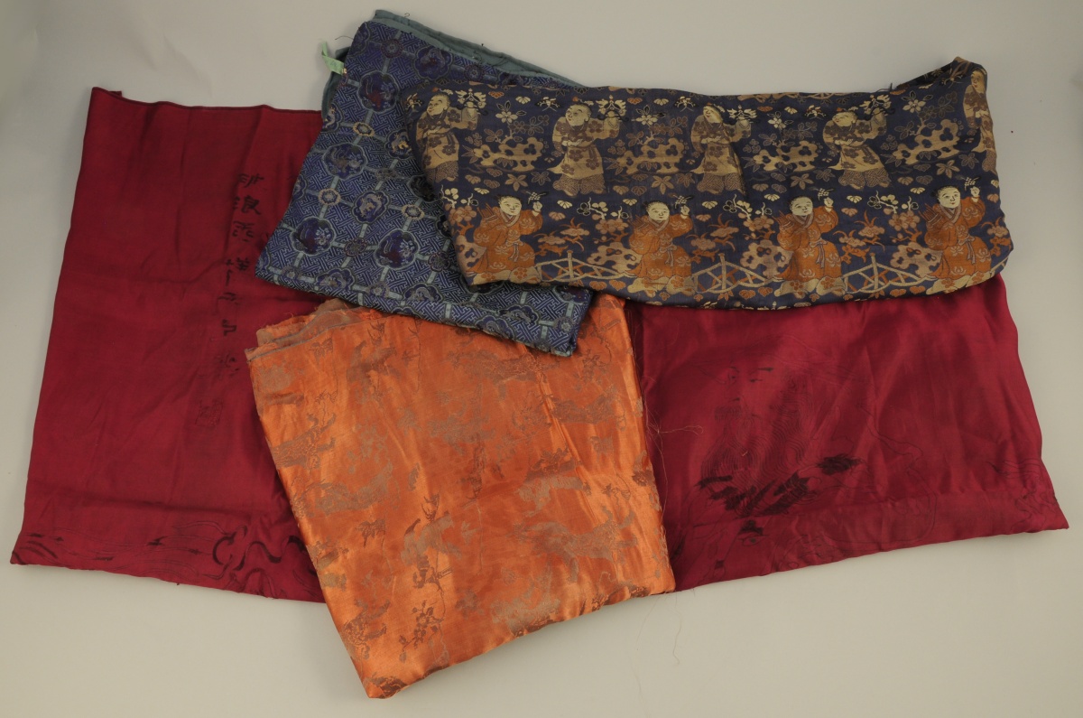 ENSEMBLE DE TISSUS dont parties de jupes, panneaux, bandes de manches et carrés de mandarins.