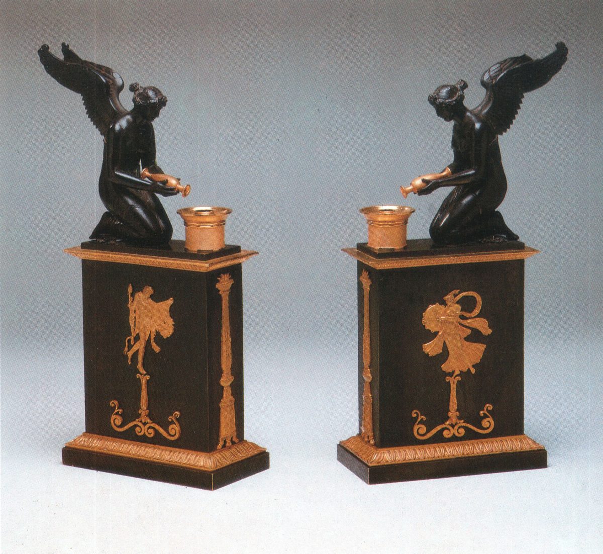 Rare PAIRE DE CHANDELIERS à ressort en bronze ciselé patiné et doré. Base parallélépipédique à décor de torchères, danseuses au tambourin et guerriers à l'antique, sur laquelle repose une nymphe ailée agenouillée versant d'une amphore de l'huile dans un brasier. Empire. Haut. 40, Long. 22, Larg. 9,5 cm.
