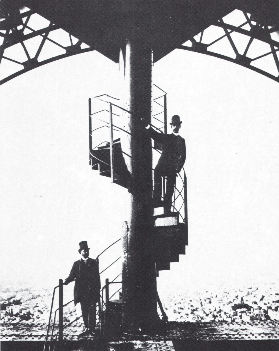 Deux tronçons du célèbre escalier hélicoïdal reliant le deuxième au troisième étage de la Tour Eiffel. Escalier unique d'une hauteur totale de 160 mètres. Celui-ci a dû être découpé au chalumeau en tronçons -dont deux sont présentés ici -et descendu au sol par un treuil.