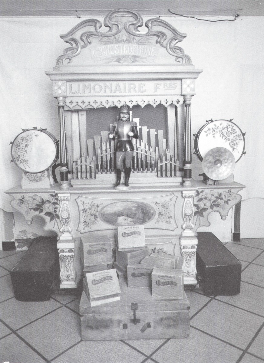 LIMONAIRE dans son meuble à décor de scènes peintes de paysage et bouquets fleuris. Fronton à volutes Art Nouveau. Avec soldat de la Garde républicaine en grand uniforme, en façade. 31 boîtes de cartons perforés dans leur emballage d'origine. Parfait mécanisme en excellent état. Piano, mandoline, xylophone, métalophone, 2 grosses caisses appa¬rentes, cymbales, à 92 tuyaux d'orgue. 1929.