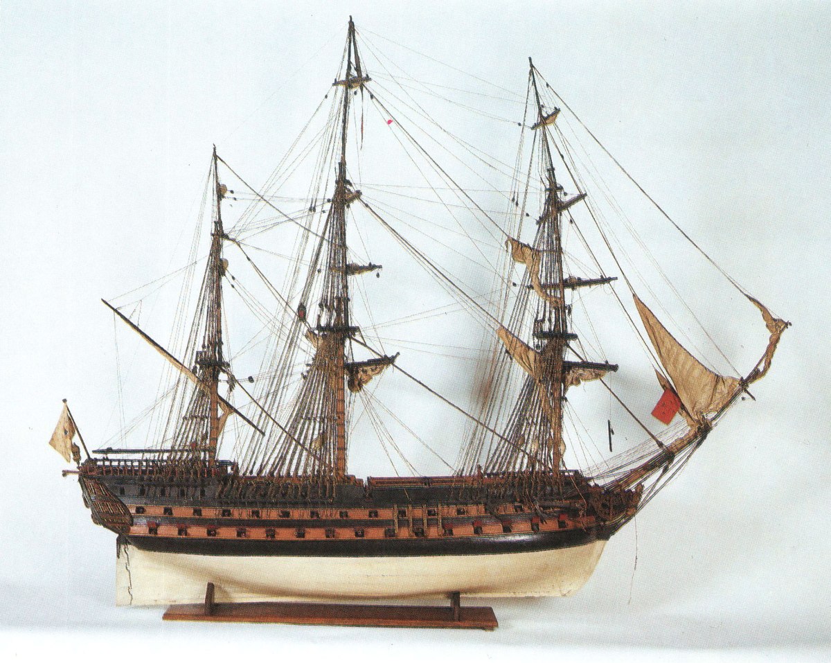 LE CONQUÉRANT de la Marine royale française. Ce vaisseau, à deux ponts, fut construit à Toulon en 1745-1746. Portant un équipage de 650 hommes, il se distingua à la bataille de Barfleur et fut affecté au port de Bordeaux en 1775. Brillant comportement à la bataille d'Ouessant en 1778. Prit une part active à la guerre d'Indépendance américaine, fut pris lors de l'expédition d'Egypte à la bataille d'Aboukir par l'amiral Nelson en 1798. Finit comme ponton dans un port anglais pour les prisonniers fran¬çais. Doyen de toutes les flottes, il fit grand honneur à « la construction française durant 58 ans ». Maquette de grande finition, bois, trois mâts gréés, armée de trois rangs de canons (66 au total). Figure de proue au guerrier à l'antique. Travail du début du XIXe. Long. 1,90 (de la proue à la poupe: 1,55 m), Haut. 1,71 m.