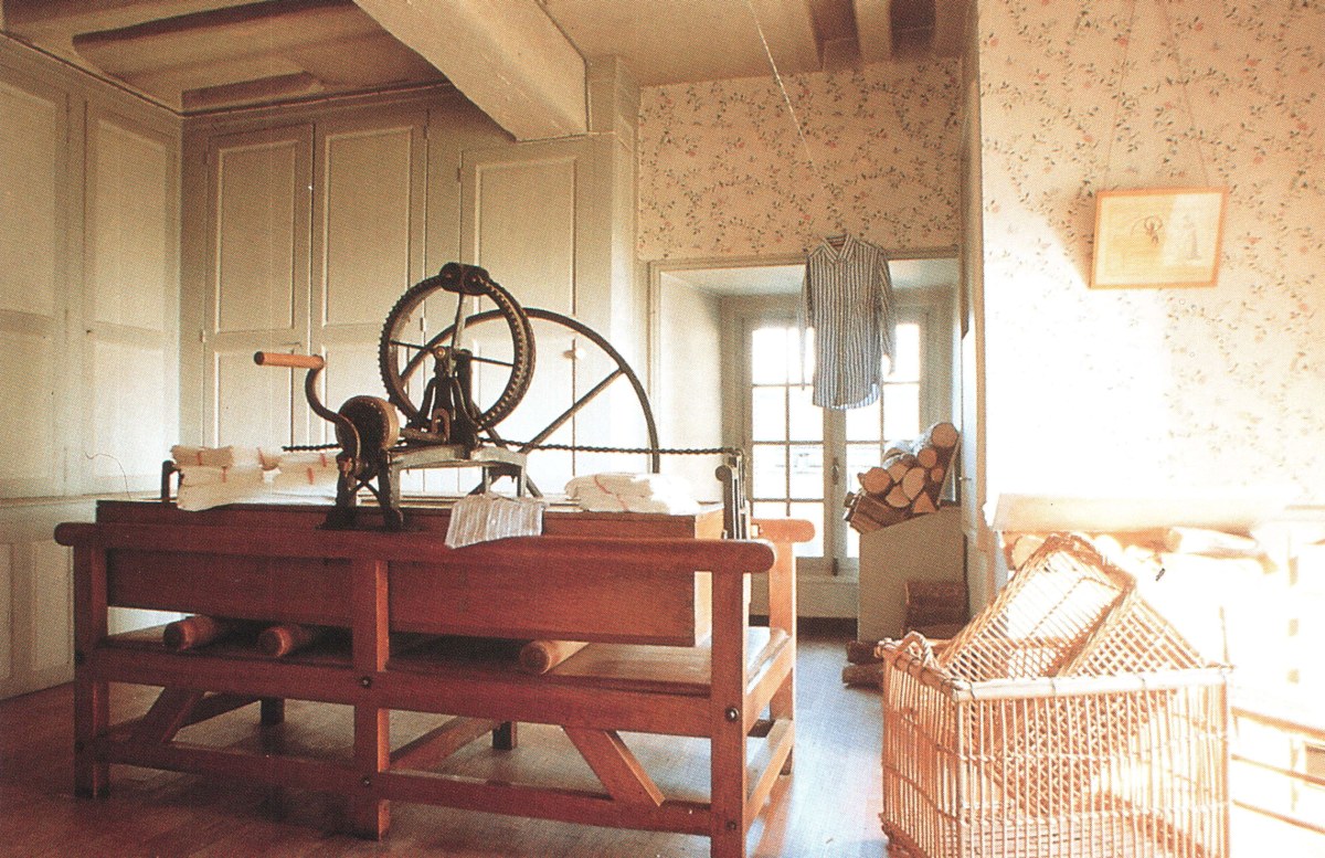 PRESSE A LINGE, rare machine à repasser. Bois naturel, roues avec système de crémaillère et cylindres mobiles.