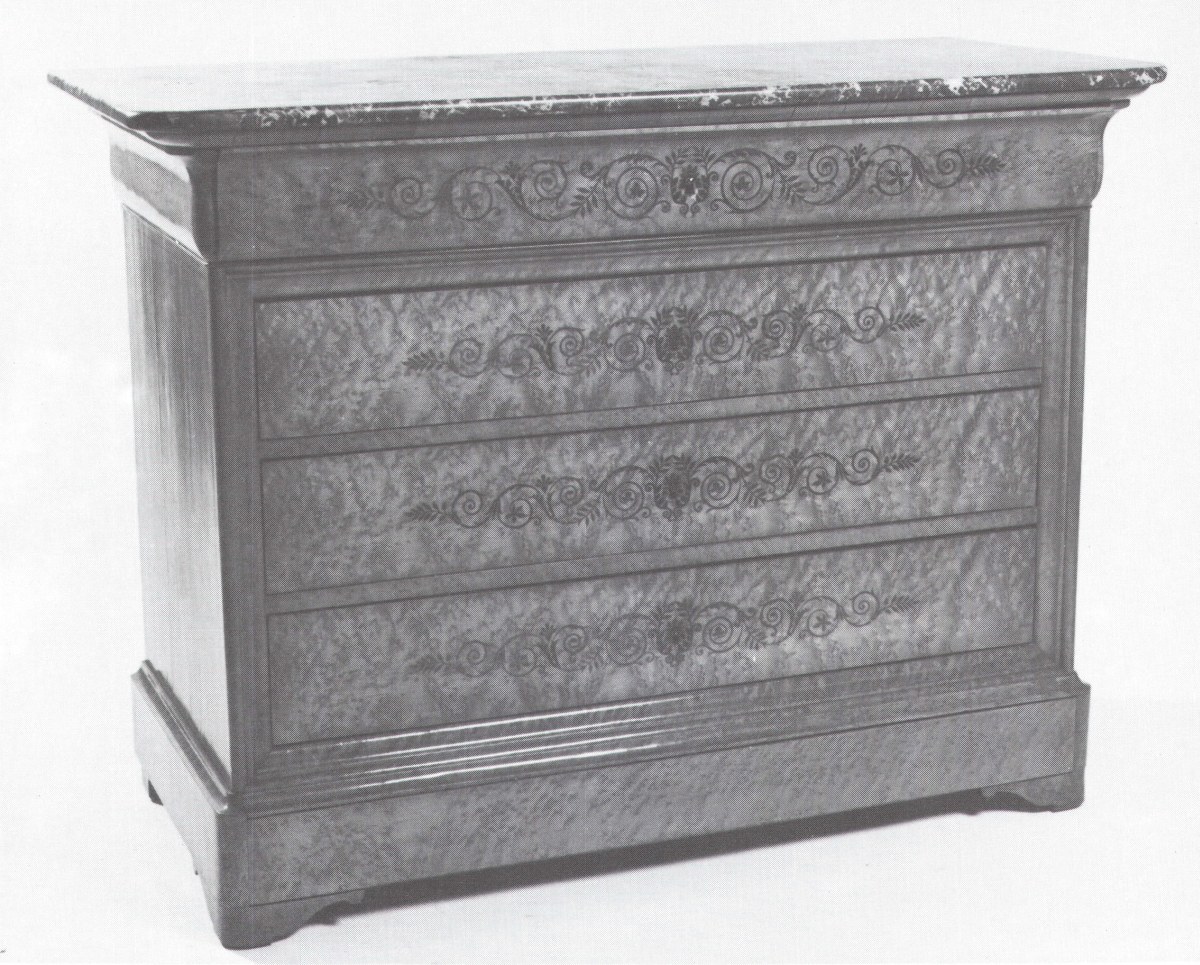 COMMODE en loupe de bois clair, ouvrant à 4 niveaux de tiroirs dont 1 à doucine ― marqueterie de filets de bois sombre, à décor de palmettes et entrelacs. Dessus marbre gris Sainte-Anne. Charles X. Haut. 99, Long. 131, Prof. 60 cm.