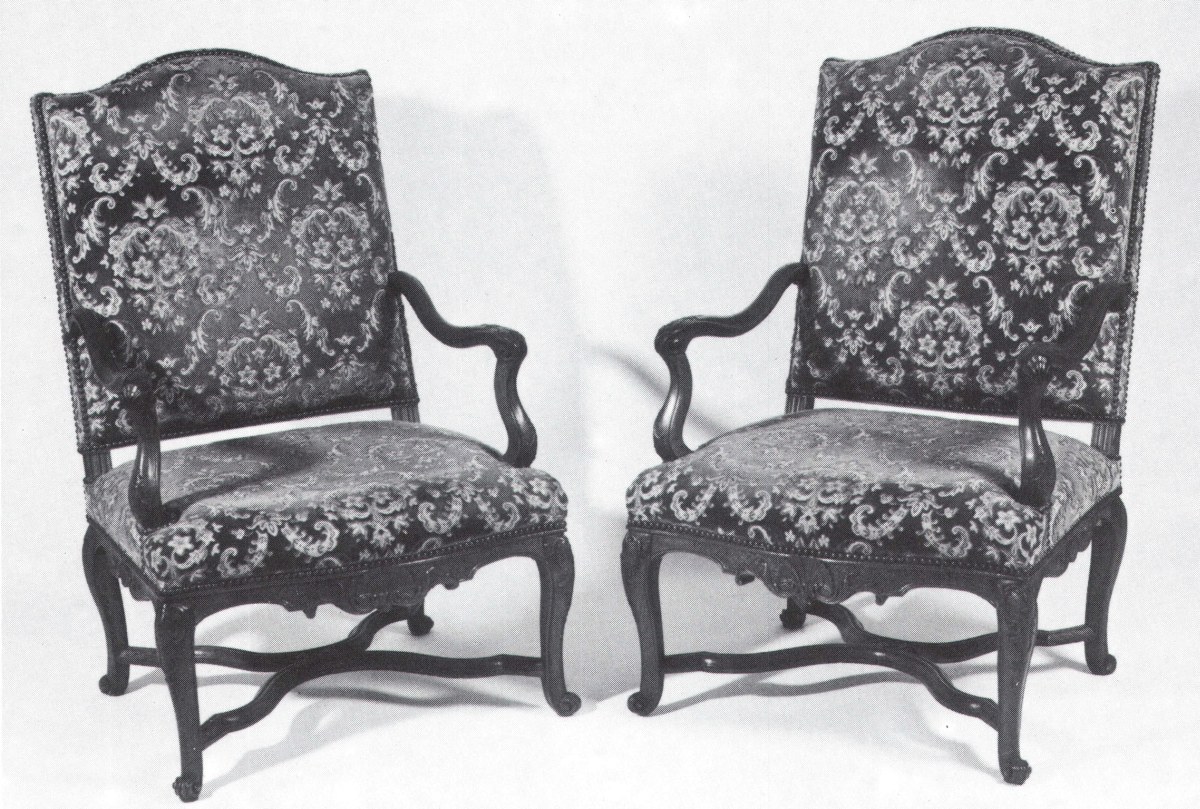 PAIRE DE FAUTEUILS à haut dossier, en hêtre mouluré et finement sculpté de rinceaux, feuillages et coquilles. Bras reculés, entrejambe à croisillons, support d'accotoir à la crosse déviée vers l'extérieur. Régence.